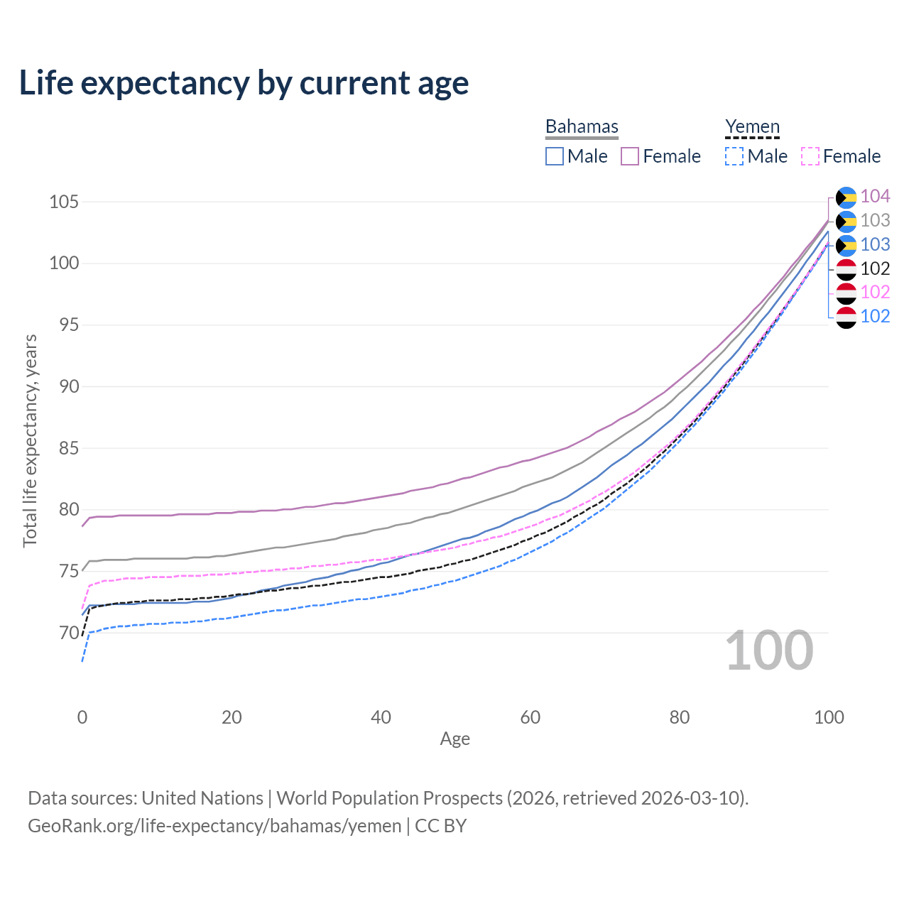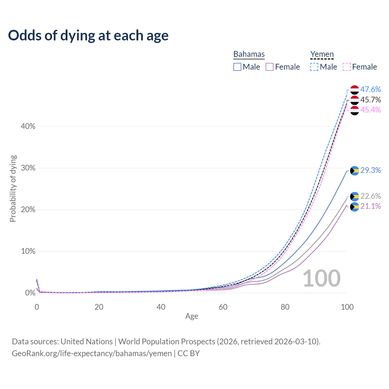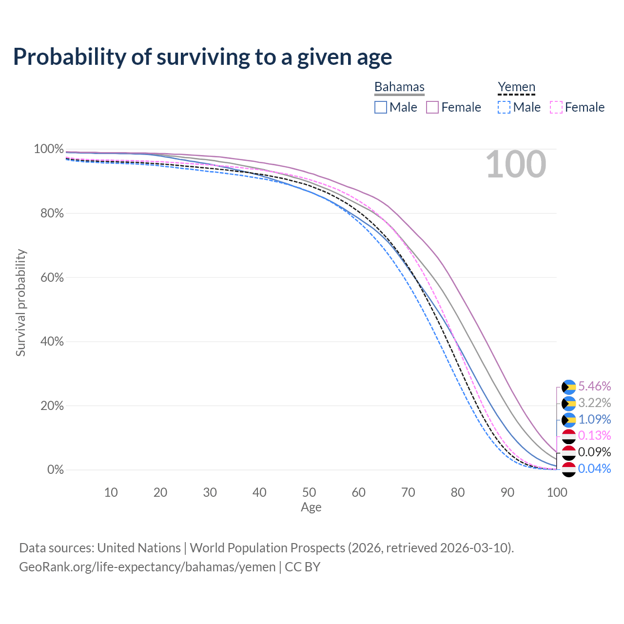 This life expectancy calculator shows the odds of living to 100, 95, 90, and below based on current age for both males and females in the Bahamas and Yemen, along with mean and median age of death. The calculations are based on the 2026 life tables (actuarial tables) from the UN World Population Prospects.