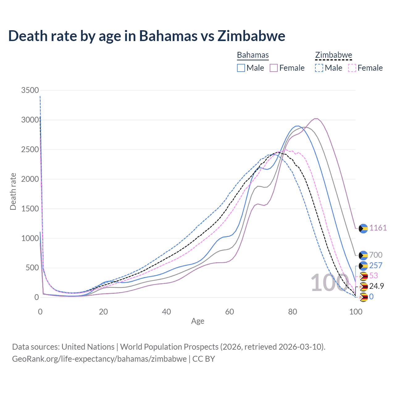 In the Bahamas, the most common age of death is 84, compared to 0 in Zimbabwe. The median age of death is 79.2 in the Bahamas and 68.8 in Zimbabwe, meaning only half of each cohort is expected to live past that age.