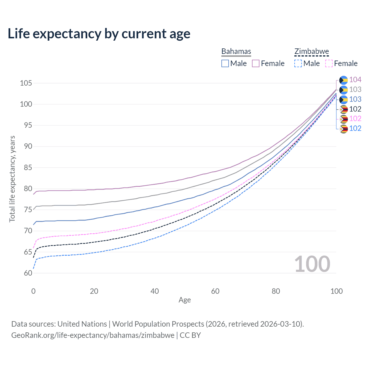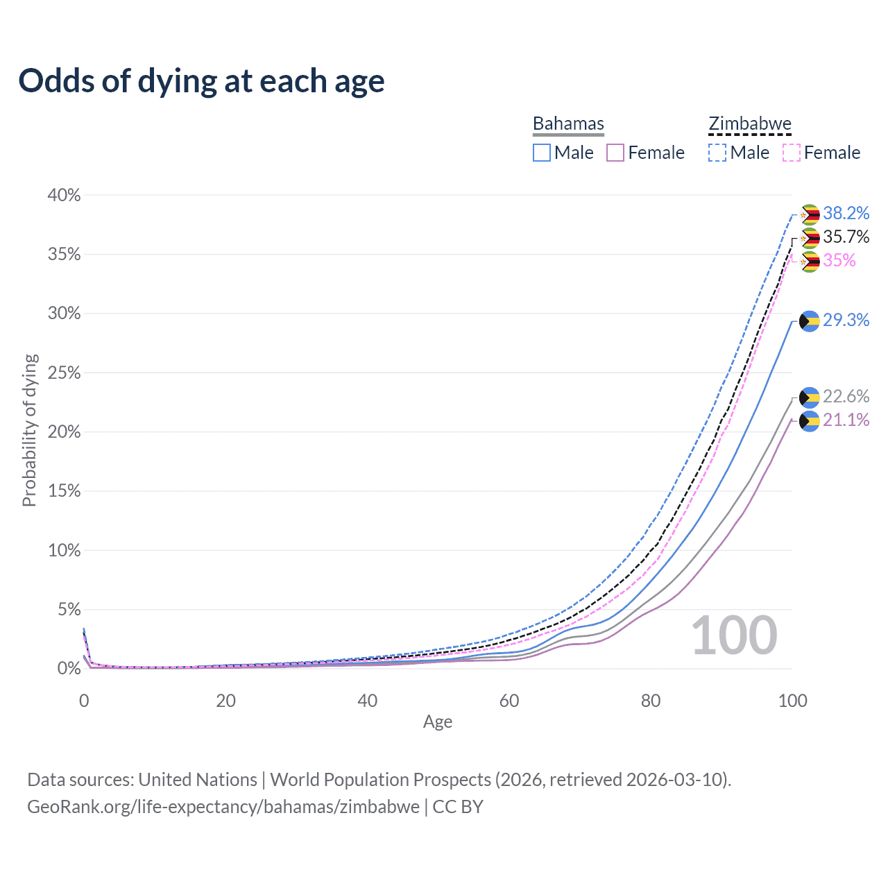 This life expectancy calculator shows the odds of living to 100, 95, 90, and below based on current age for both males and females in the Bahamas and Zimbabwe, along with mean and median age of death. The calculations are based on the 2026 life tables (actuarial tables) from the UN World Population Prospects.