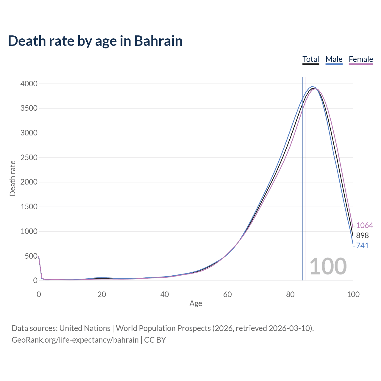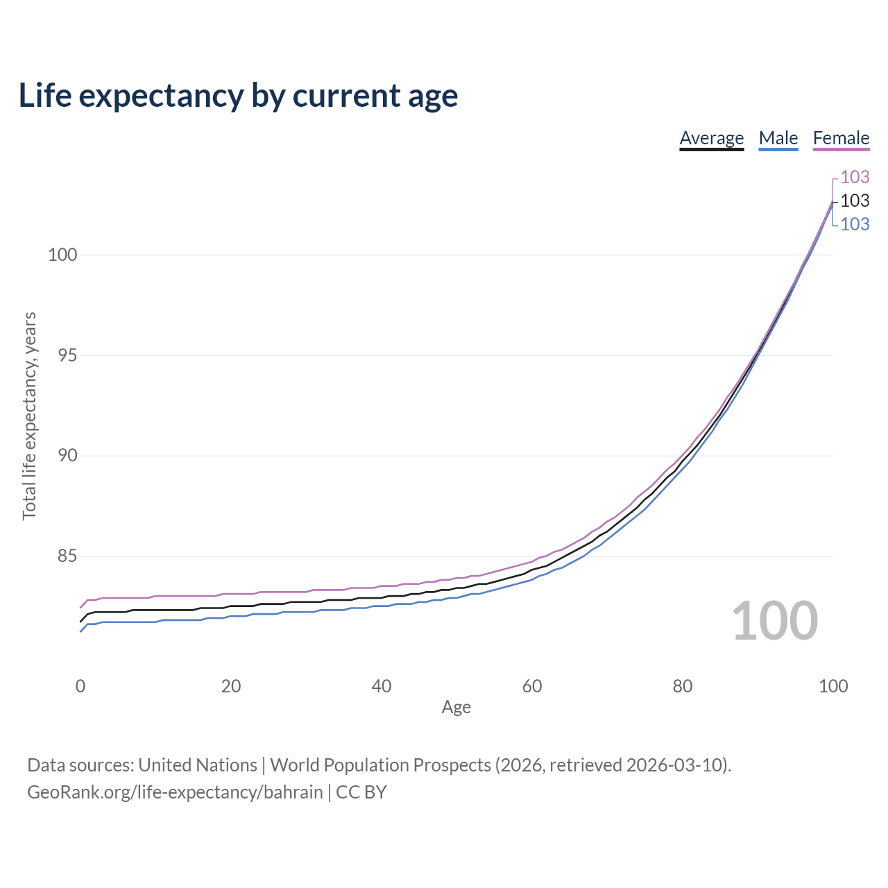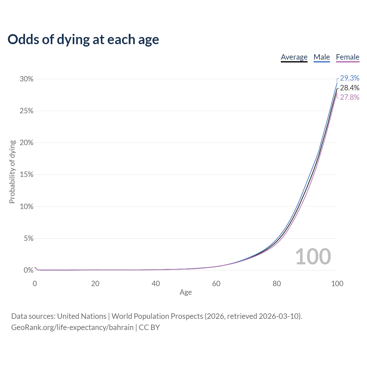 This life expectancy calculator shows the odds of living to 100, 95, 90, and below based on current age for both males and females in Bahrain, along with mean and median age of death. The calculations are based on the 2026 life tables (actuarial tables) from the UN World Population Prospects.