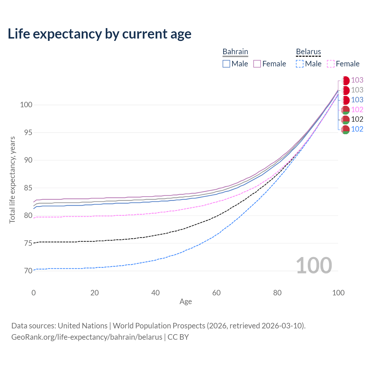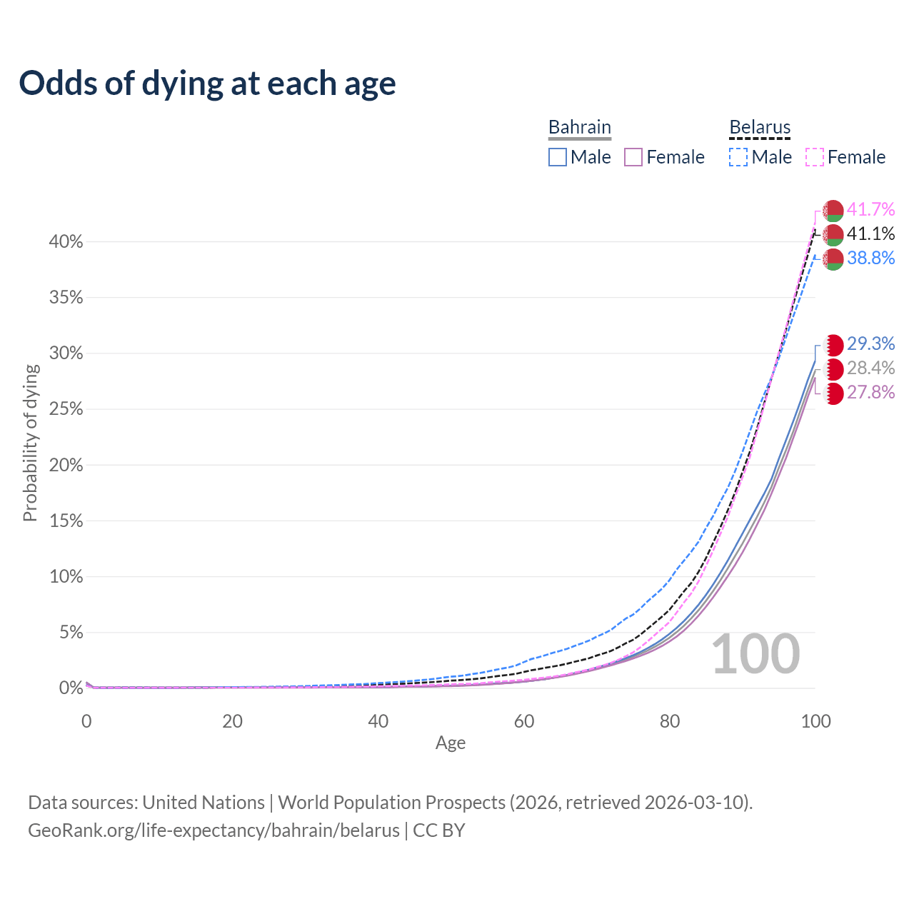 This life expectancy calculator shows the odds of living to 100, 95, 90, and below based on current age for both males and females in Bahrain and Belarus, along with mean and median age of death. The calculations are based on the 2026 life tables (actuarial tables) from the UN World Population Prospects.