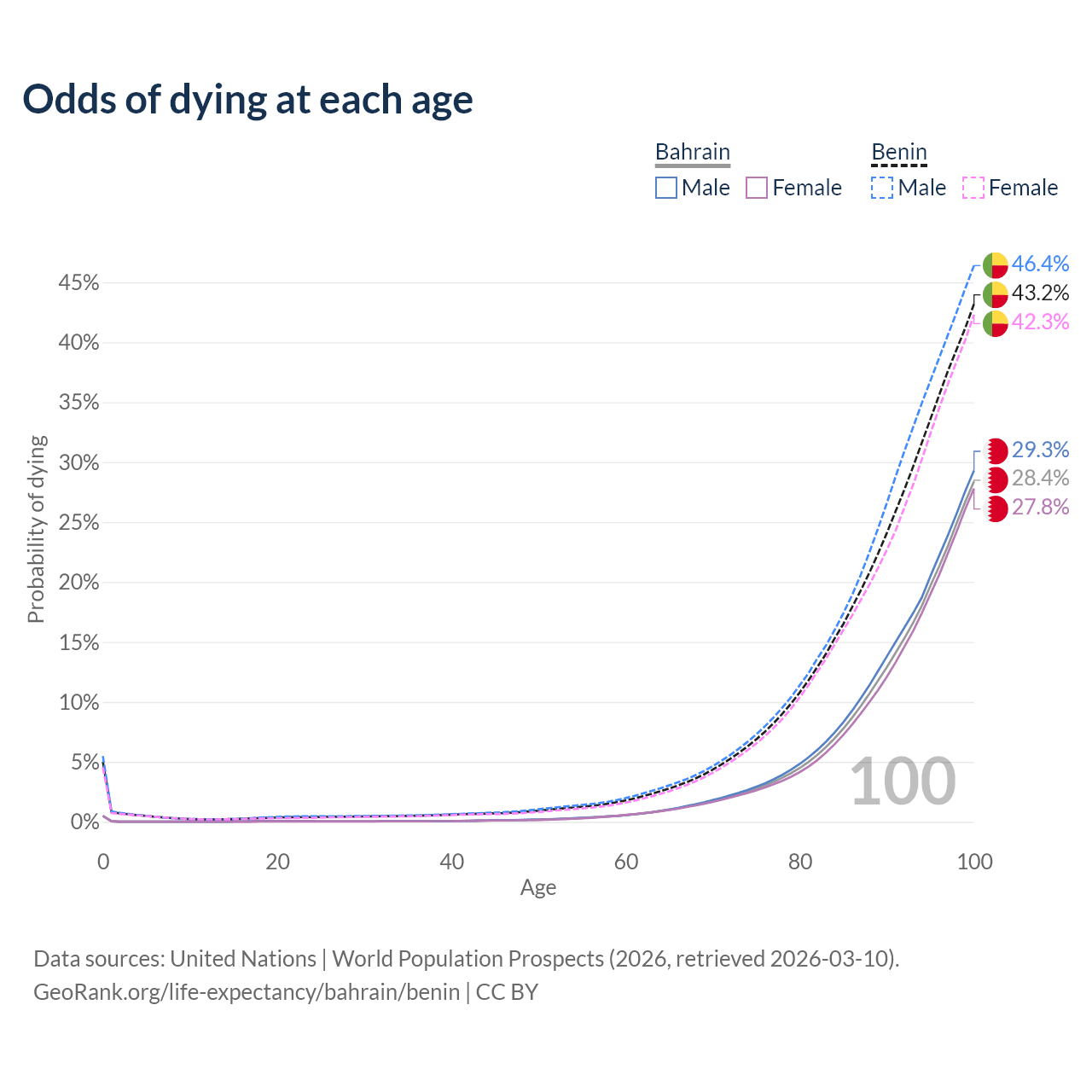 This life expectancy calculator shows the odds of living to 100, 95, 90, and below based on current age for both males and females in Bahrain and Benin, along with mean and median age of death. The calculations are based on the 2026 life tables (actuarial tables) from the UN World Population Prospects.