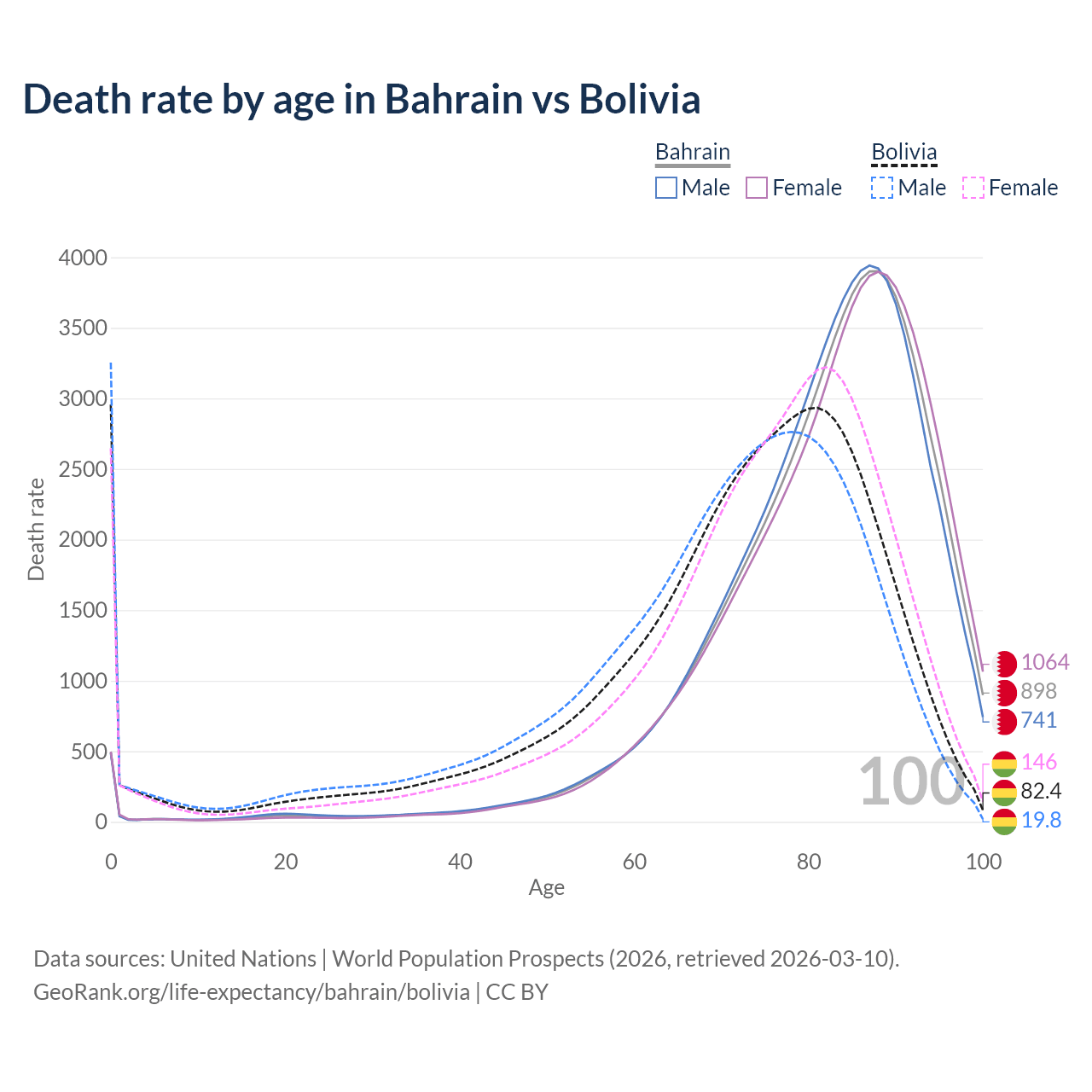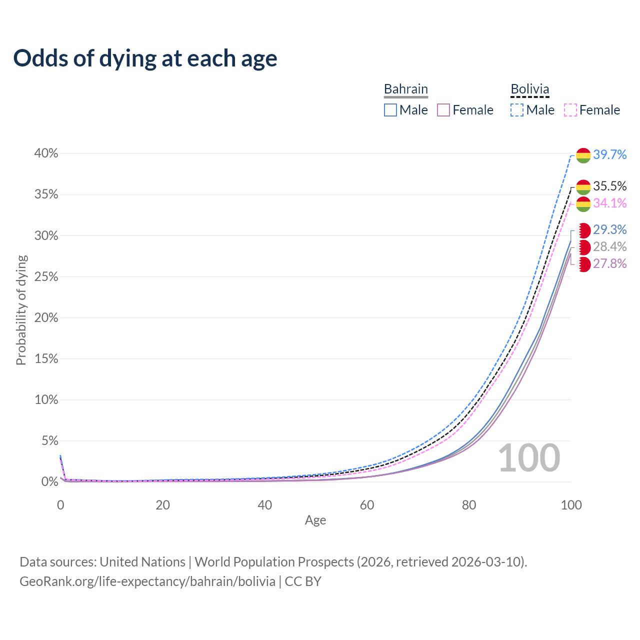 This life expectancy calculator shows the odds of living to 100, 95, 90, and below based on current age for both males and females in Bahrain and Bolivia, along with mean and median age of death. The calculations are based on the 2026 life tables (actuarial tables) from the UN World Population Prospects.