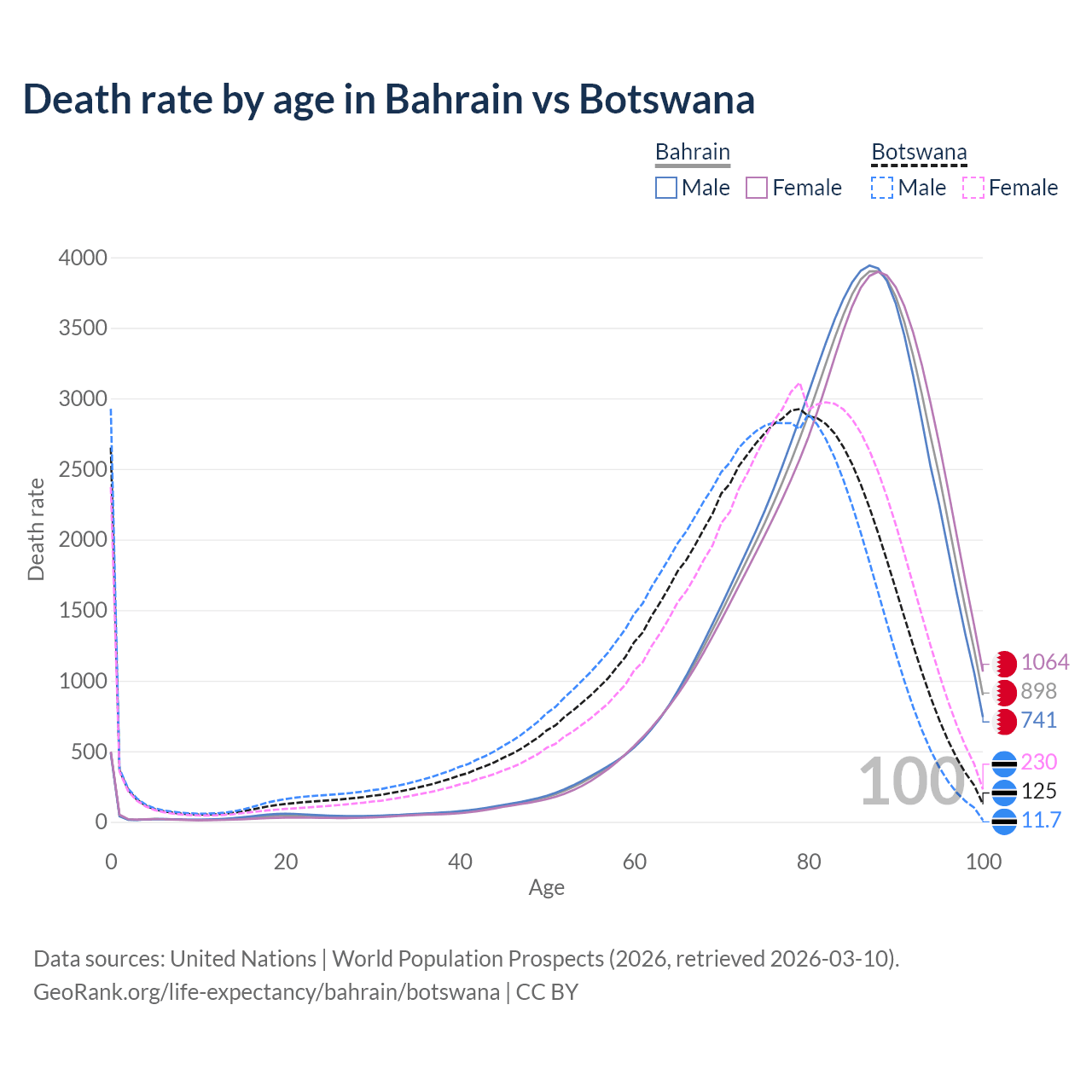 In Bahrain, the most common age of death is 88, compared to 79 in Botswana. The median age of death is 84.4 in Bahrain and 74.4 in Botswana, meaning only half of each cohort is expected to live past that age.