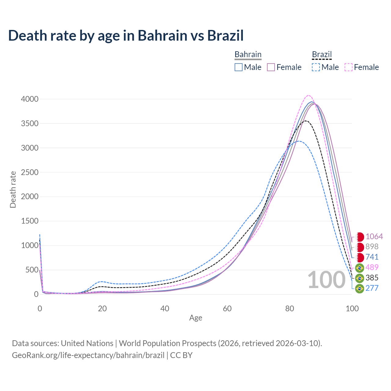 This life expectancy calculator shows the odds of living to 100, 95, 90, and below based on current age for both males and females in Bahrain and Brazil, along with mean and median age of death. The calculations are based on the 2026 life tables (actuarial tables) from the UN World Population Prospects.