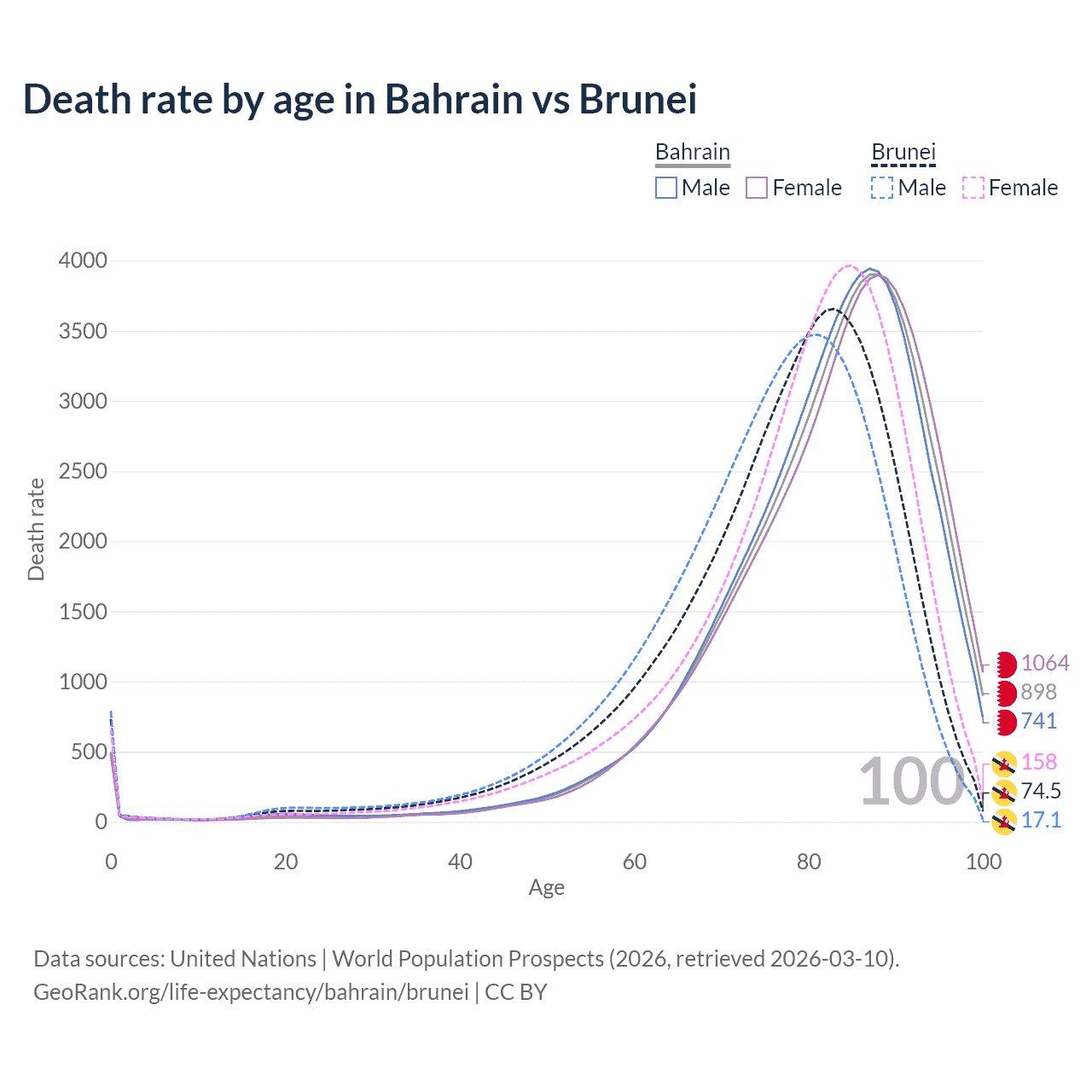 In Bahrain, the most common age of death is 88, compared to 83 in Brunei. The median age of death is 84.4 in Bahrain and 79.2 in Brunei, meaning only half of each cohort is expected to live past that age.
