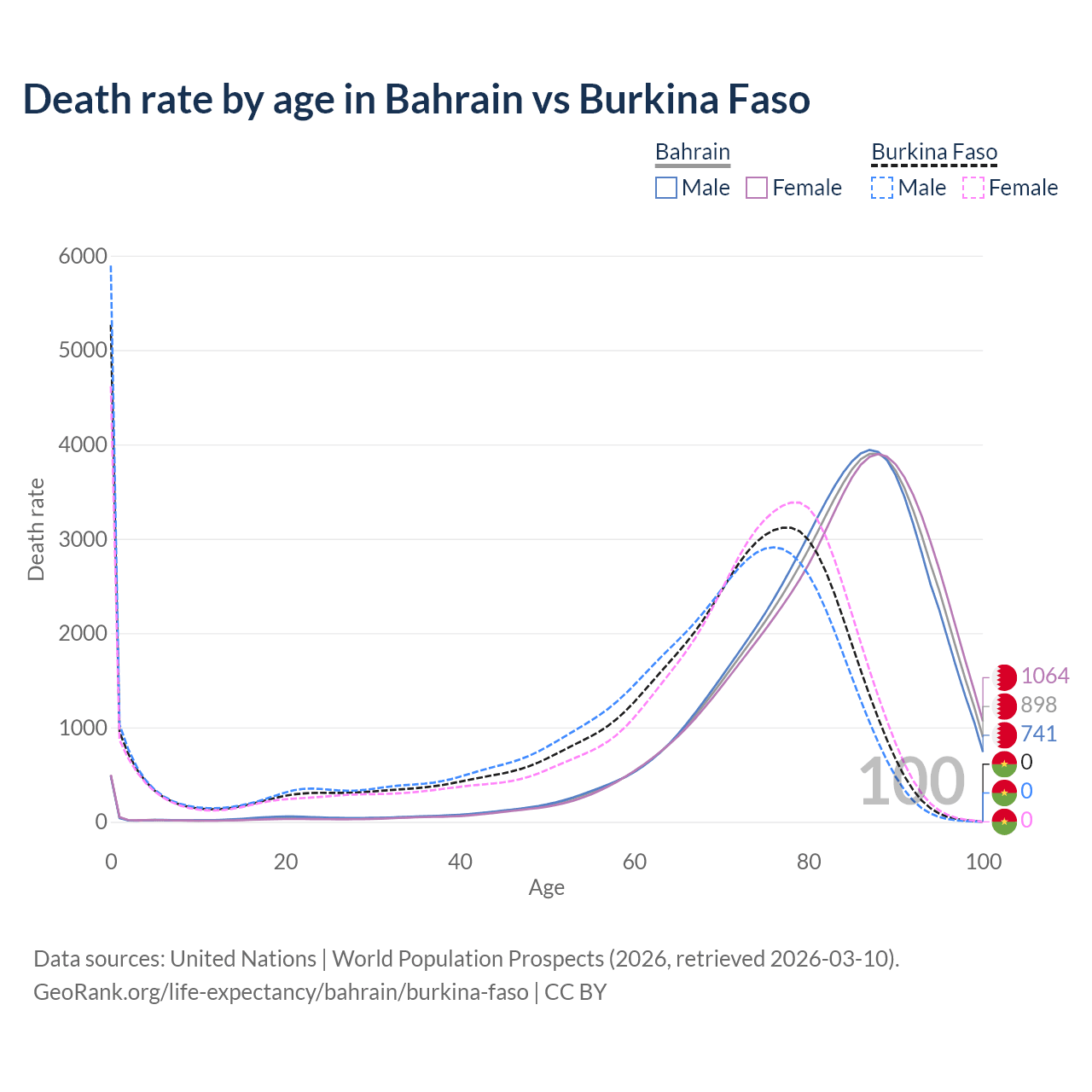 In Bahrain, the most common age of death is 88, compared to 0 in Burkina Faso. The median age of death is 84.4 in Bahrain and 70.4 in Burkina Faso, meaning only half of each cohort is expected to live past that age.