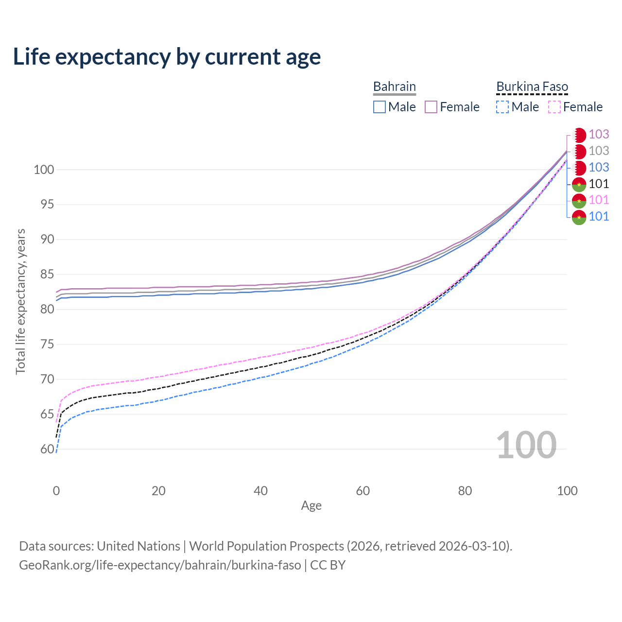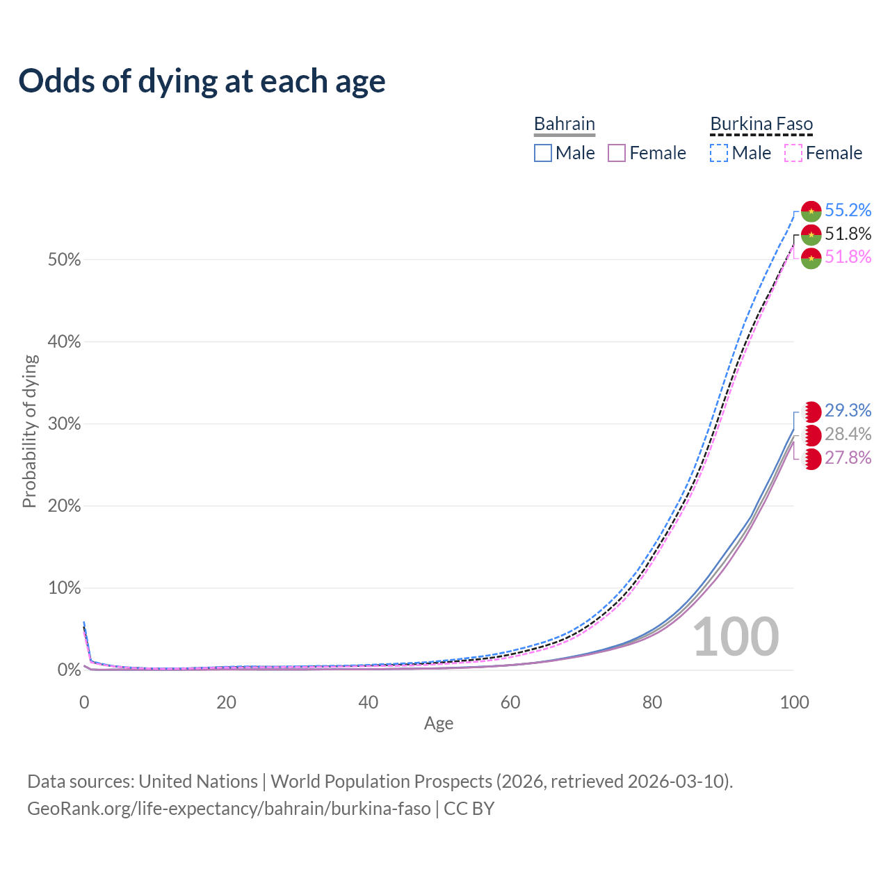 This life expectancy calculator shows the odds of living to 100, 95, 90, and below based on current age for both males and females in Bahrain and Burkina Faso, along with mean and median age of death. The calculations are based on the 2026 life tables (actuarial tables) from the UN World Population Prospects.