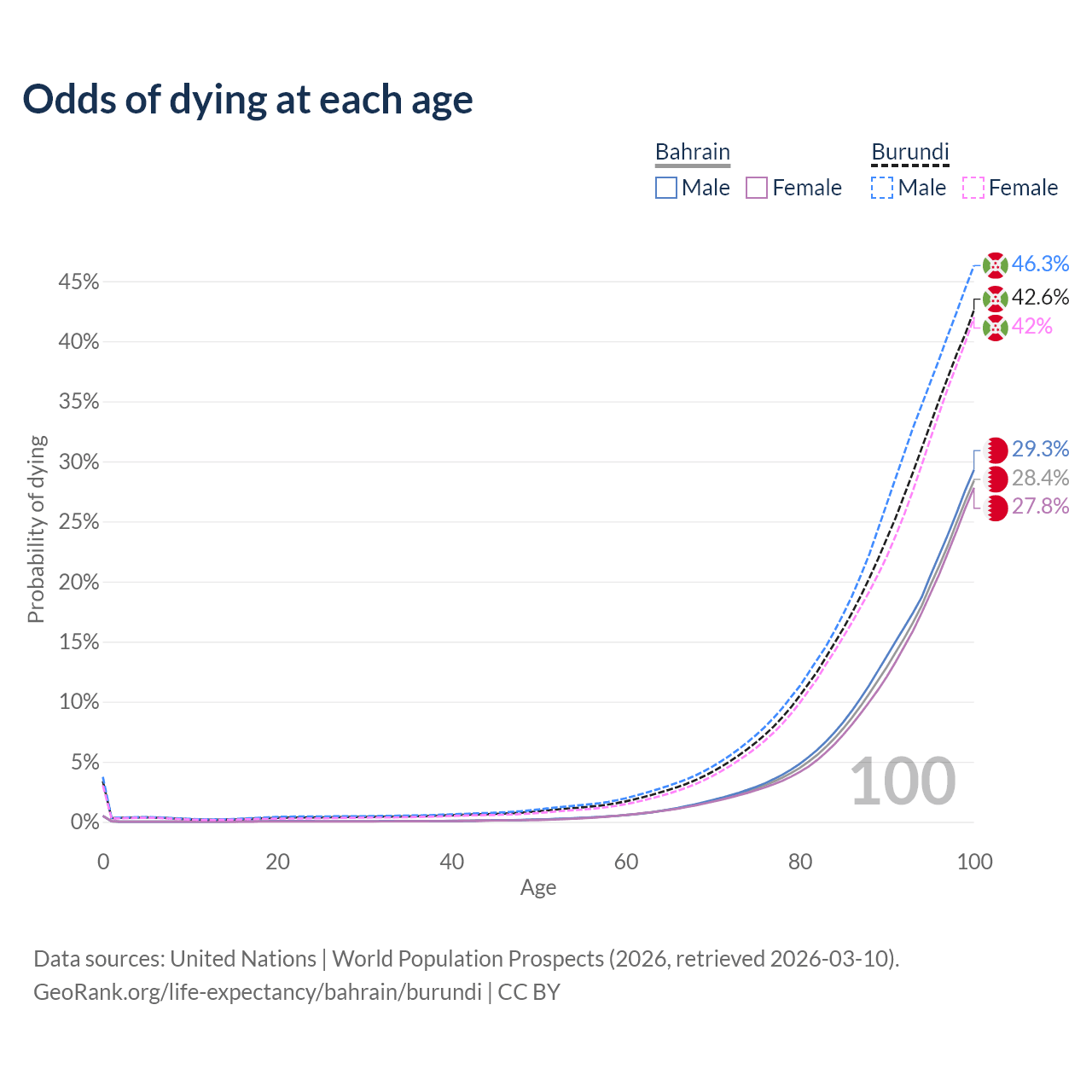 This life expectancy calculator shows the odds of living to 100, 95, 90, and below based on current age for both males and females in Bahrain and Burundi, along with mean and median age of death. The calculations are based on the 2026 life tables (actuarial tables) from the UN World Population Prospects.