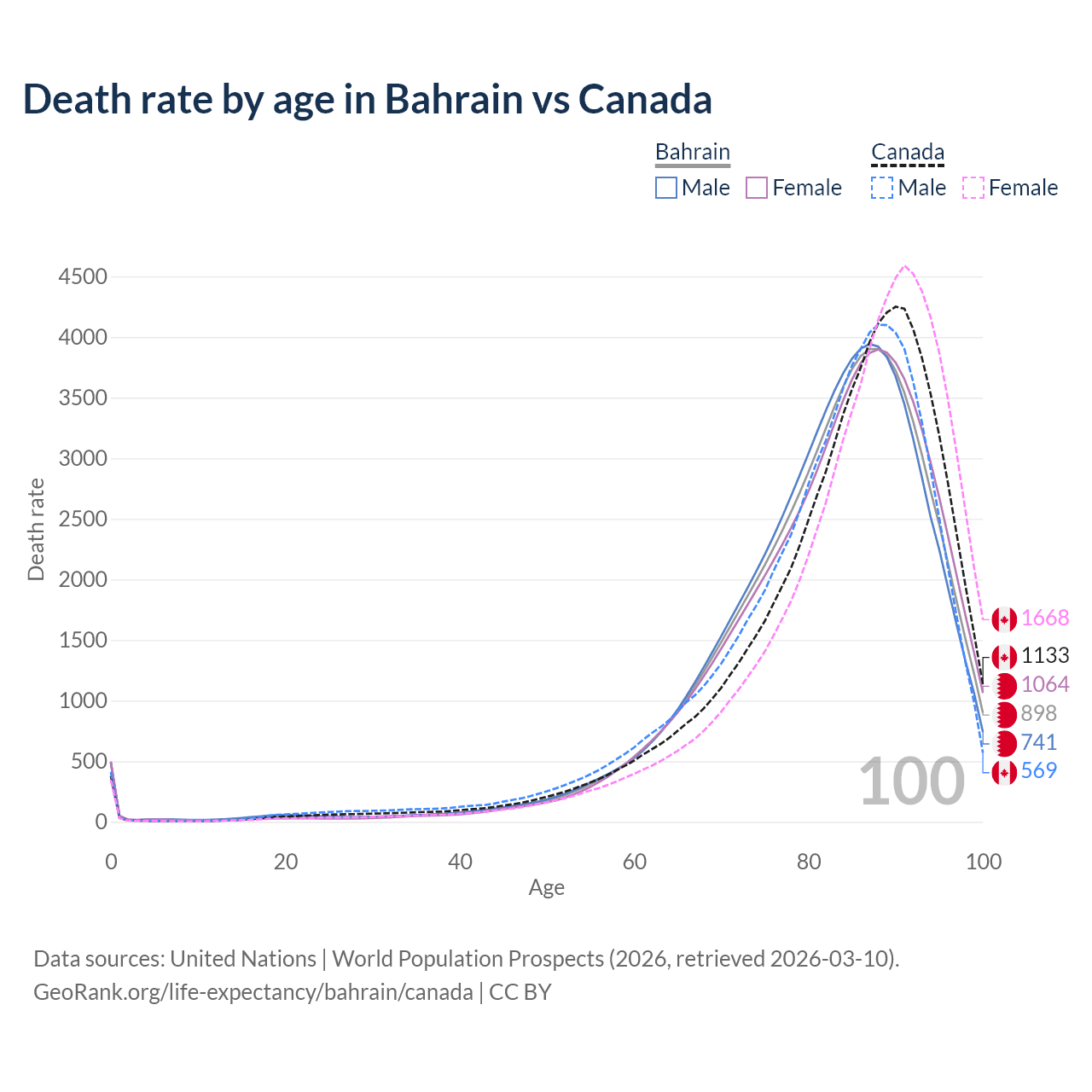 This life expectancy calculator shows the odds of living to 100, 95, 90, and below based on current age for both males and females in Bahrain and Canada, along with mean and median age of death. The calculations are based on the 2026 life tables (actuarial tables) from the UN World Population Prospects.