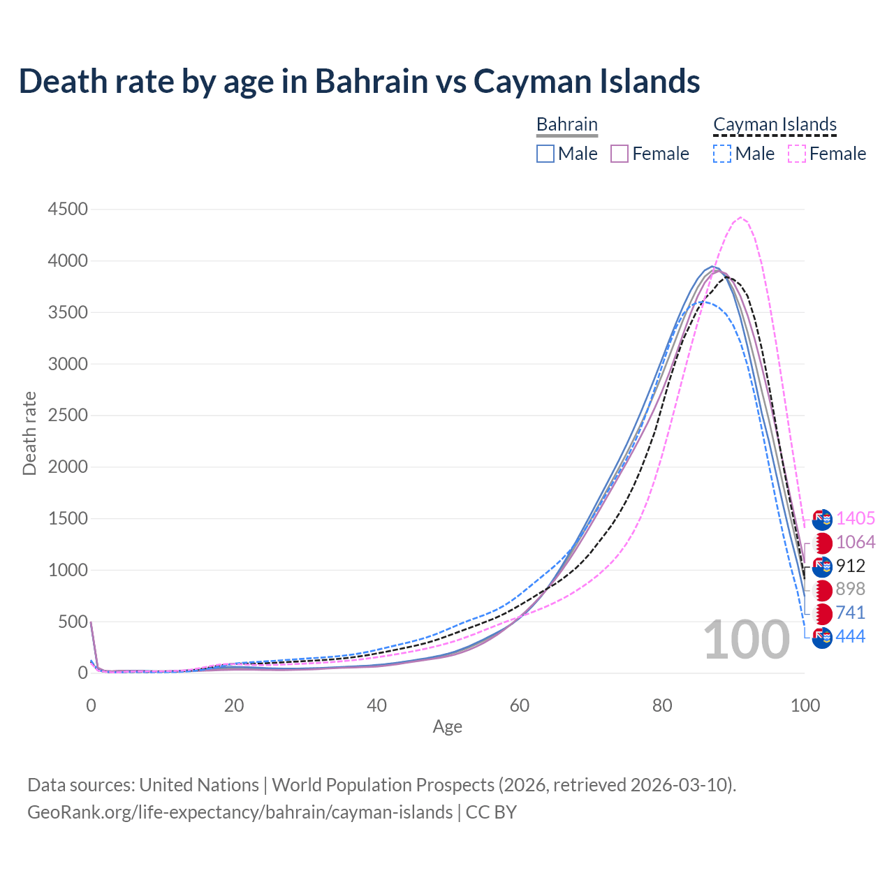 This life expectancy calculator shows the odds of living to 100, 95, 90, and below based on current age for both males and females in Bahrain and the Cayman Islands, along with mean and median age of death. The calculations are based on the 2026 life tables (actuarial tables) from the UN World Population Prospects.