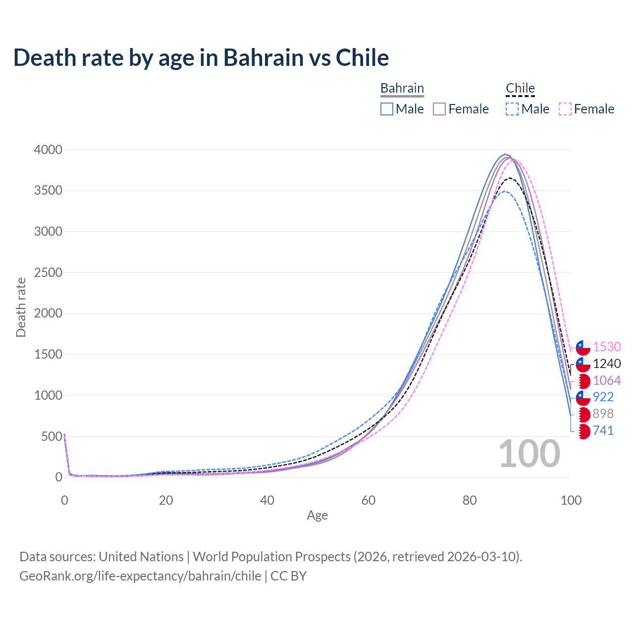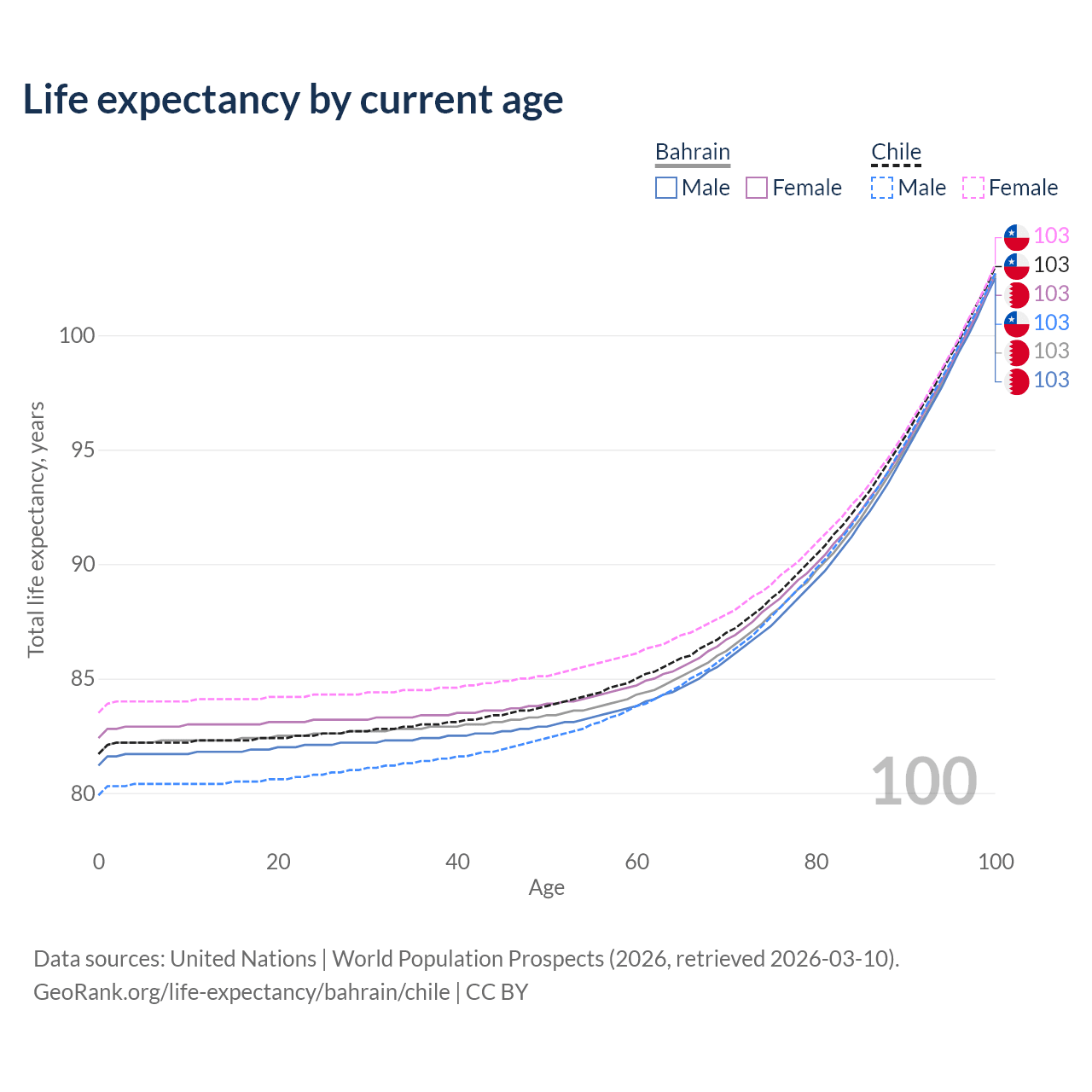 This life expectancy calculator shows the odds of living to 100, 95, 90, and below based on current age for both males and females in Bahrain and Chile, along with mean and median age of death. The calculations are based on the 2026 life tables (actuarial tables) from the UN World Population Prospects.