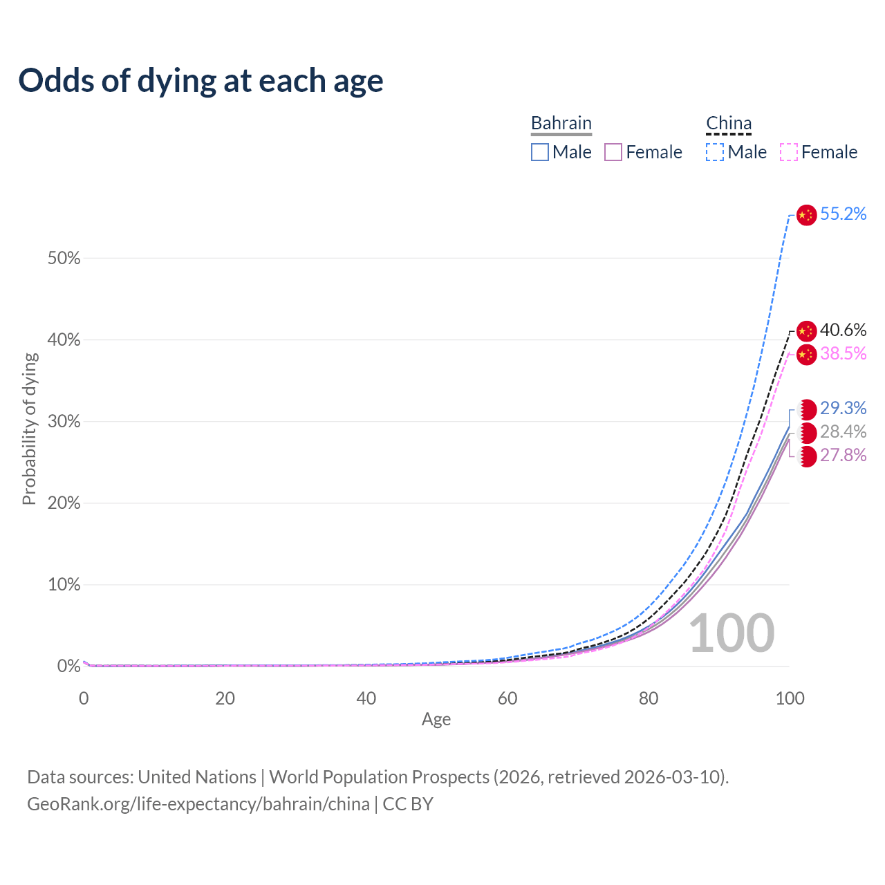 This life expectancy calculator shows the odds of living to 100, 95, 90, and below based on current age for both males and females in Bahrain and China, along with mean and median age of death. The calculations are based on the 2026 life tables (actuarial tables) from the UN World Population Prospects.