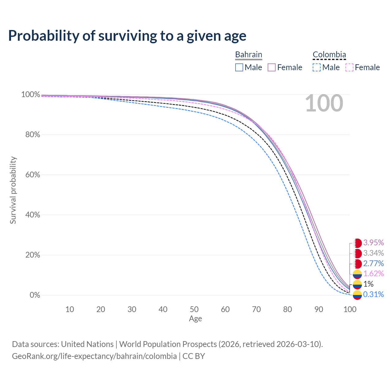 This life expectancy calculator shows the odds of living to 100, 95, 90, and below based on current age for both males and females in Bahrain and Colombia, along with mean and median age of death. The calculations are based on the 2026 life tables (actuarial tables) from the UN World Population Prospects.