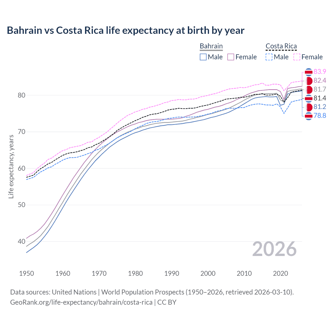 The average life expectancy at birth is 81.7 years in Bahrain vs 81.4 in Costa Rica. Bahrain is ranked 36/197 by life expectancy, and Costa Rica is 39/197. In Bahrain, the life expectancy is 81.2 years for males and 82.4 years for females. In Costa Rica, it's 78.8 years for males and 83.9 years for females.