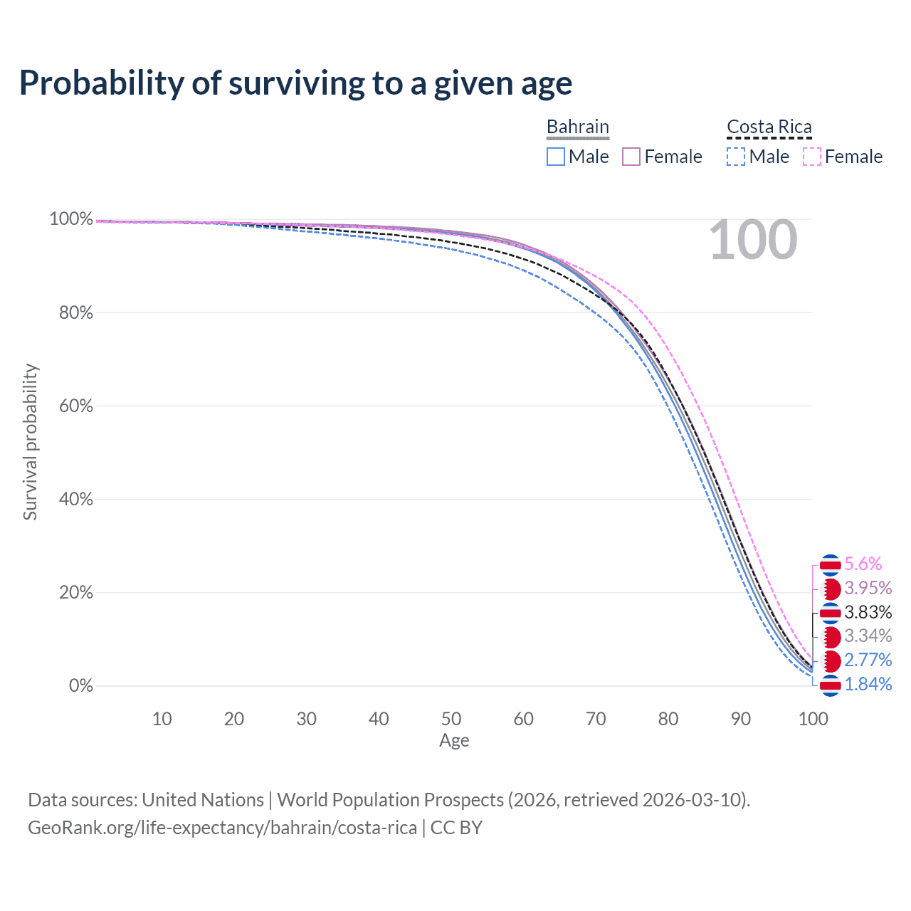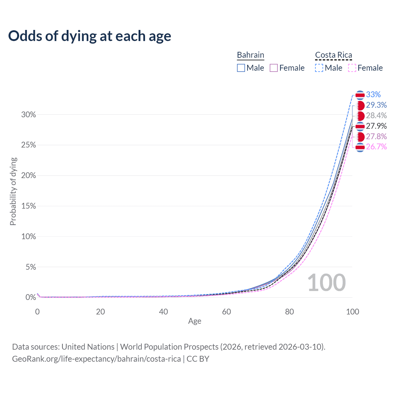 This life expectancy calculator shows the odds of living to 100, 95, 90, and below based on current age for both males and females in Bahrain and Costa Rica, along with mean and median age of death. The calculations are based on the 2026 life tables (actuarial tables) from the UN World Population Prospects.