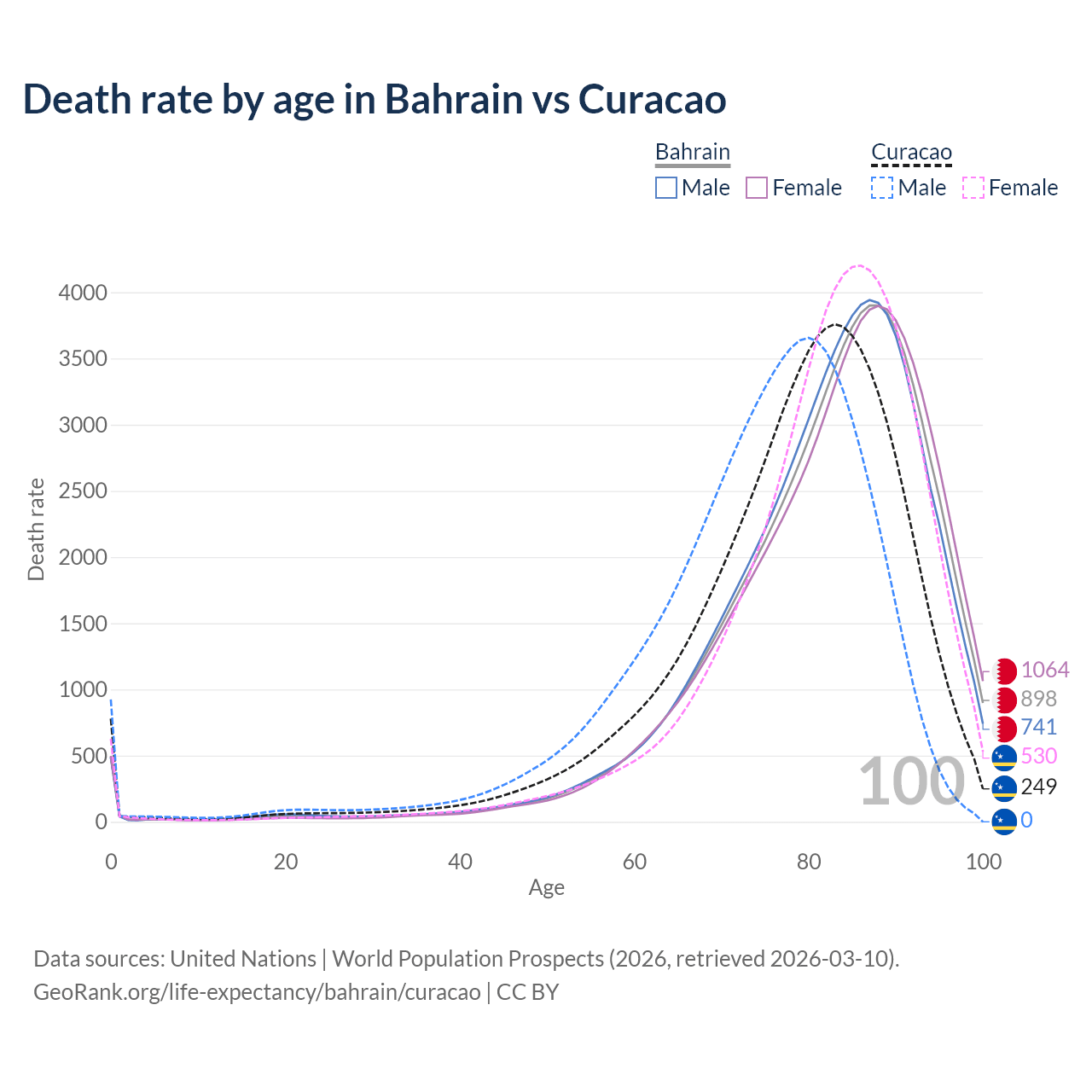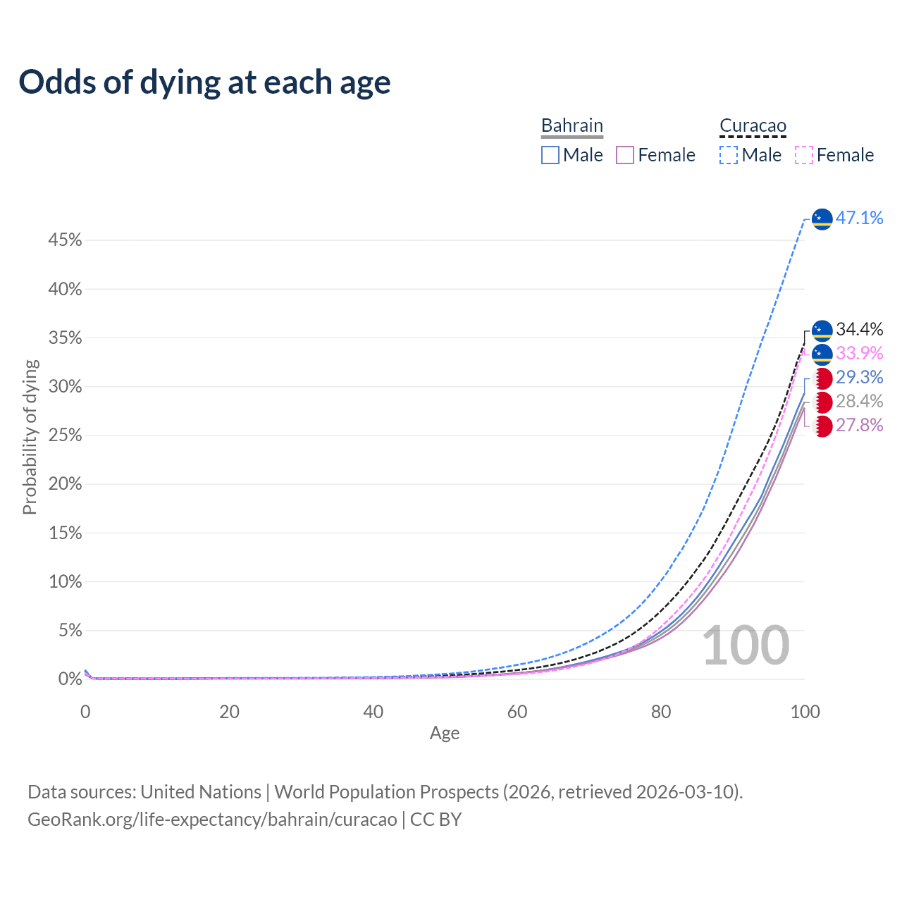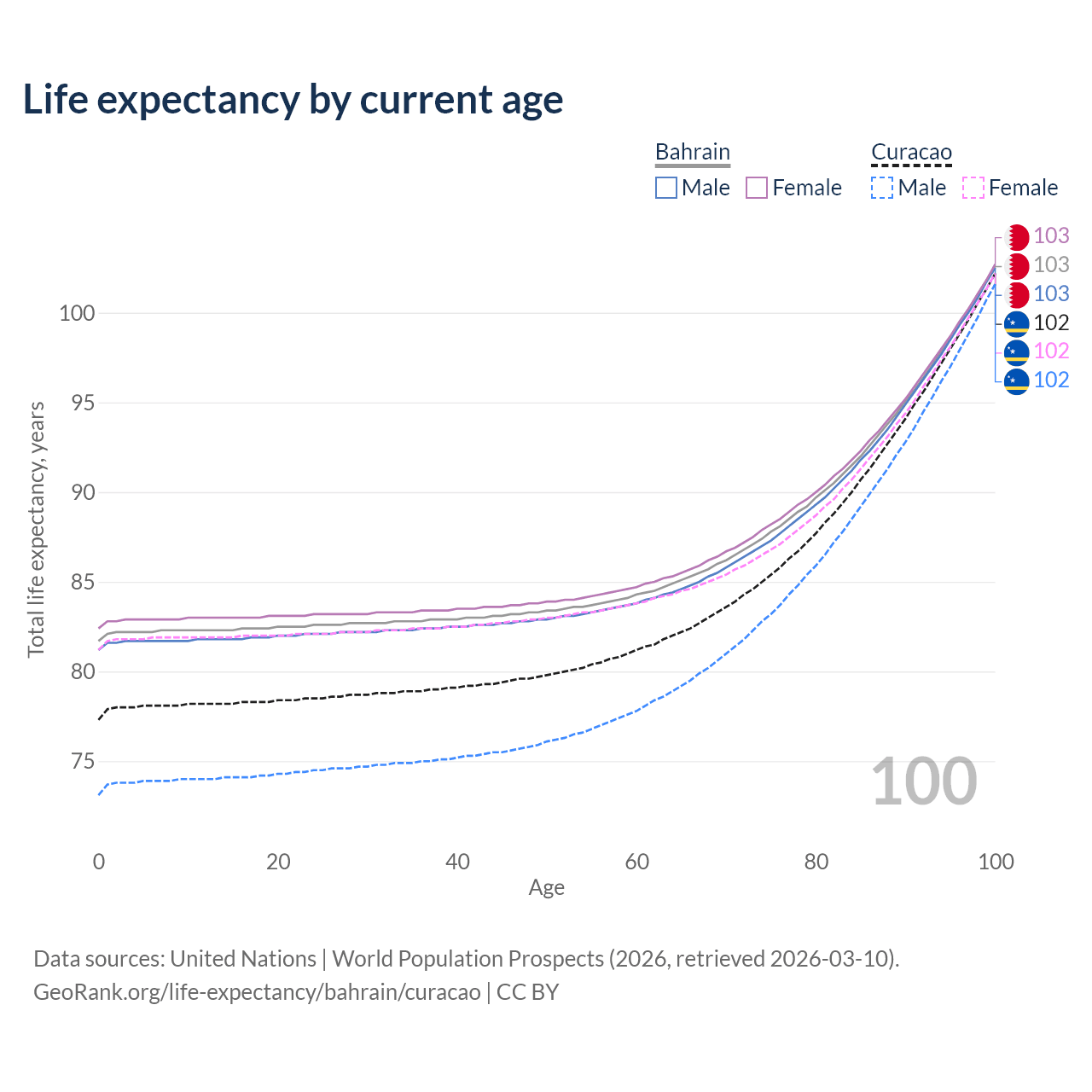 This life expectancy calculator shows the odds of living to 100, 95, 90, and below based on current age for both males and females in Bahrain and Curacao, along with mean and median age of death. The calculations are based on the 2026 life tables (actuarial tables) from the UN World Population Prospects.
