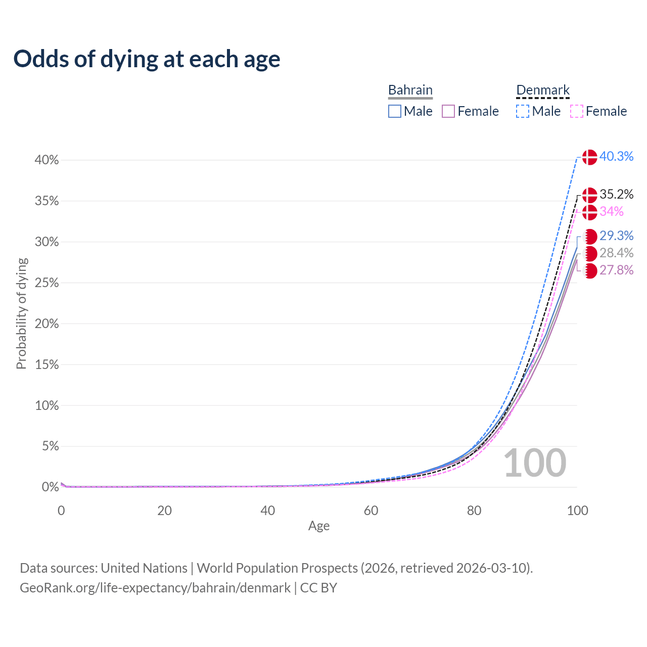 This life expectancy calculator shows the odds of living to 100, 95, 90, and below based on current age for both males and females in Bahrain and Denmark, along with mean and median age of death. The calculations are based on the 2026 life tables (actuarial tables) from the UN World Population Prospects.