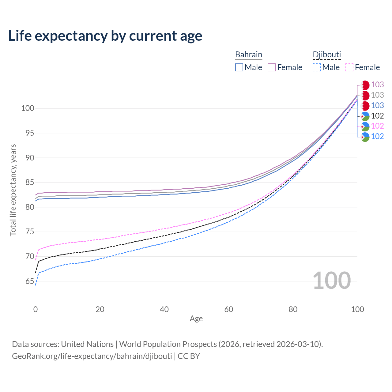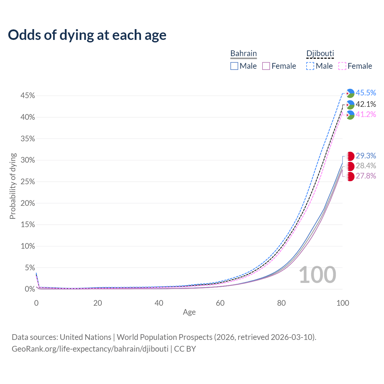 This life expectancy calculator shows the odds of living to 100, 95, 90, and below based on current age for both males and females in Bahrain and Djibouti, along with mean and median age of death. The calculations are based on the 2026 life tables (actuarial tables) from the UN World Population Prospects.