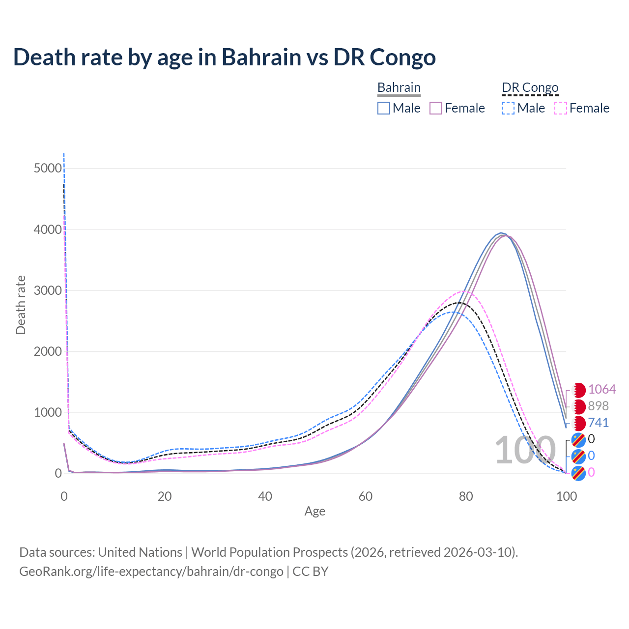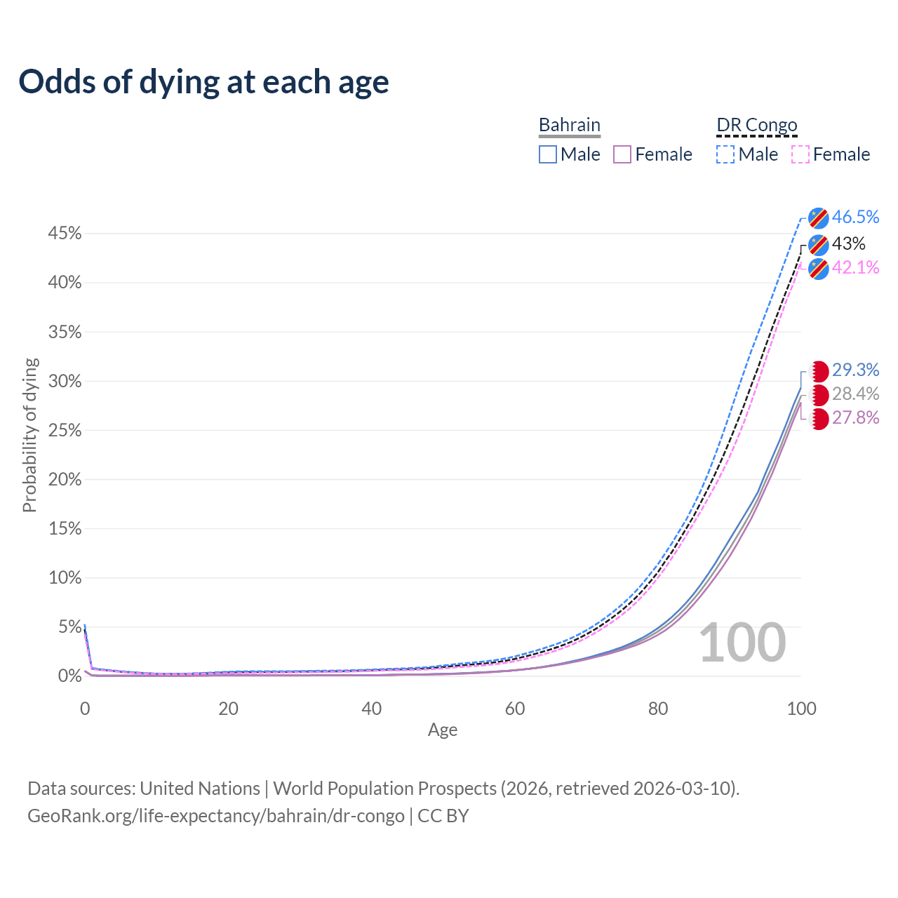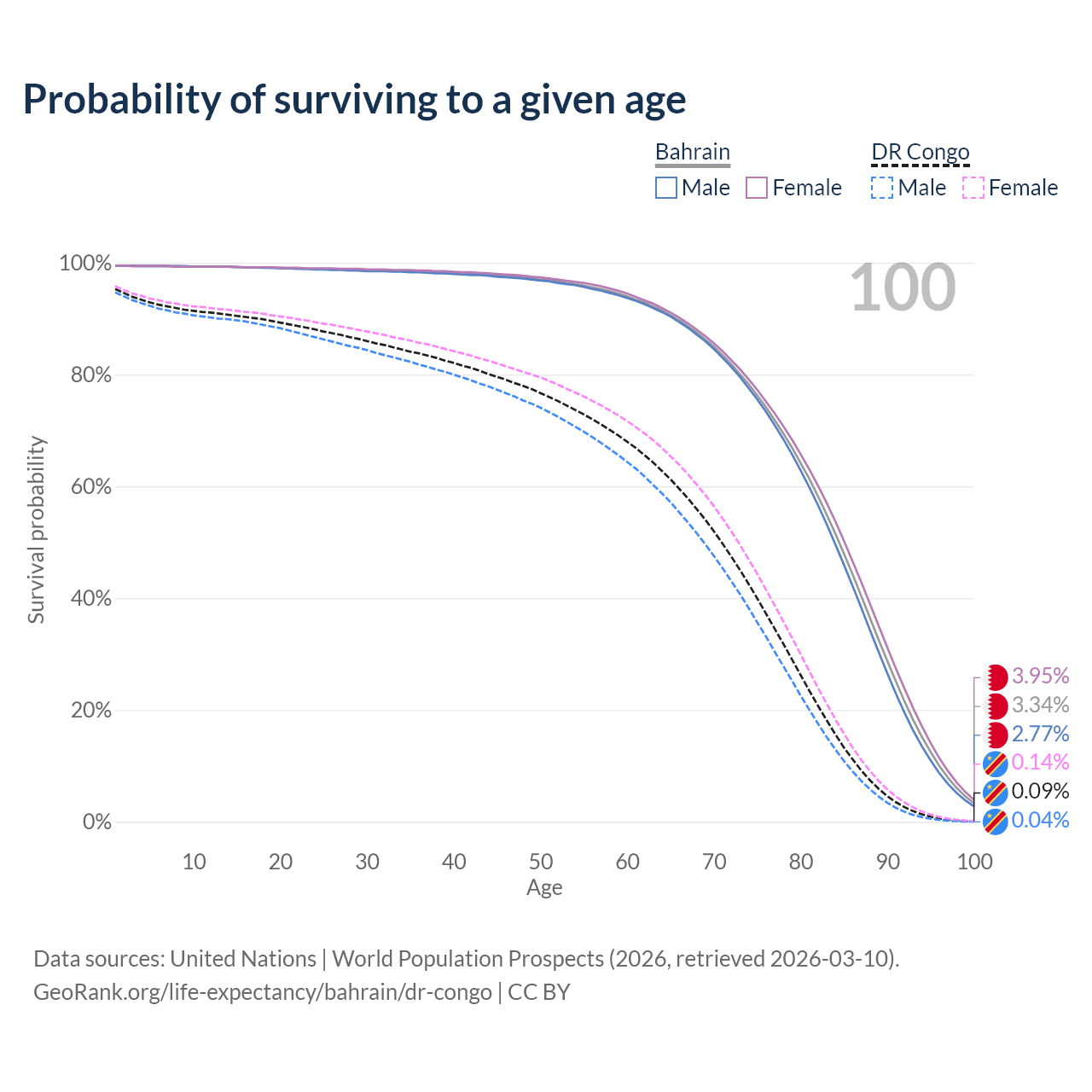 This life expectancy calculator shows the odds of living to 100, 95, 90, and below based on current age for both males and females in Bahrain and the DR Congo, along with mean and median age of death. The calculations are based on the 2026 life tables (actuarial tables) from the UN World Population Prospects.