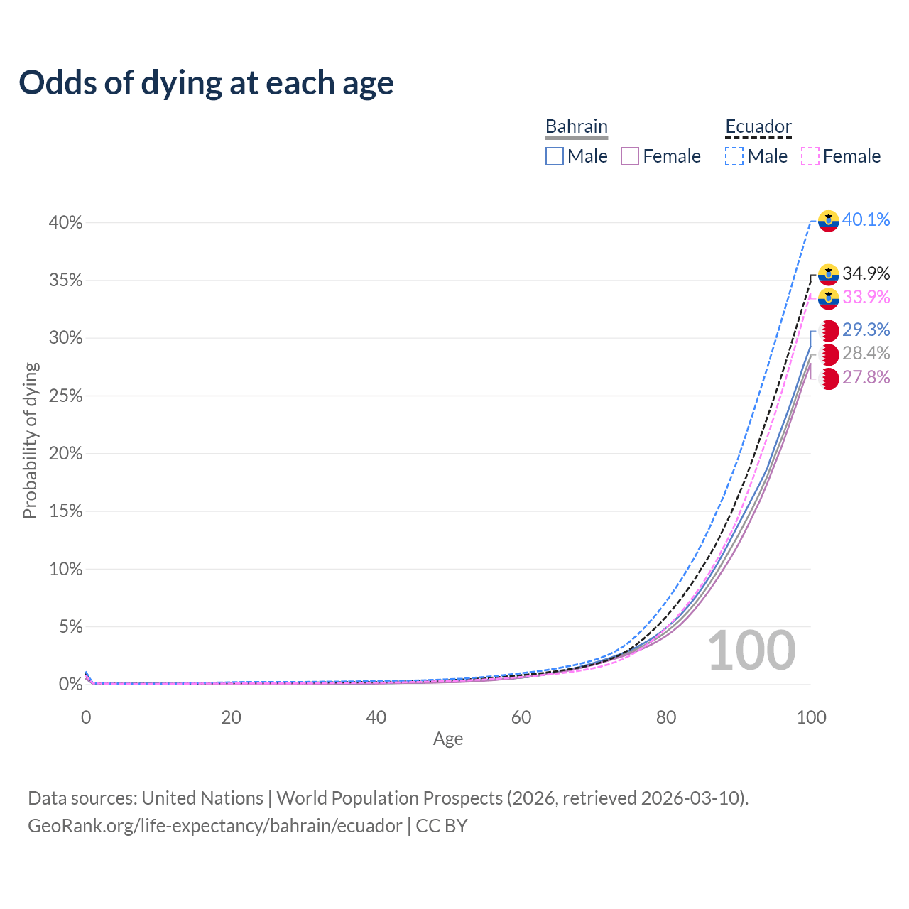 This life expectancy calculator shows the odds of living to 100, 95, 90, and below based on current age for both males and females in Bahrain and Ecuador, along with mean and median age of death. The calculations are based on the 2026 life tables (actuarial tables) from the UN World Population Prospects.