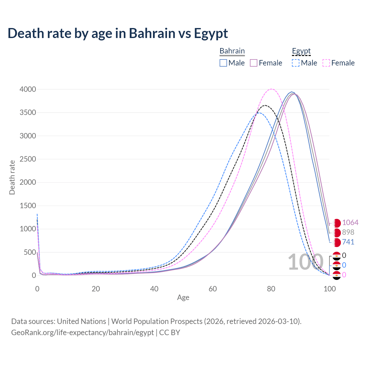 In Bahrain, the most common age of death is 88, compared to 78 in Egypt. The median age of death is 84.4 in Bahrain and 75.2 in Egypt, meaning only half of each cohort is expected to live past that age.