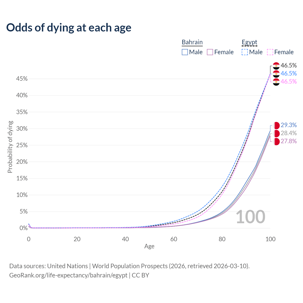 This life expectancy calculator shows the odds of living to 100, 95, 90, and below based on current age for both males and females in Bahrain and Egypt, along with mean and median age of death. The calculations are based on the 2026 life tables (actuarial tables) from the UN World Population Prospects.