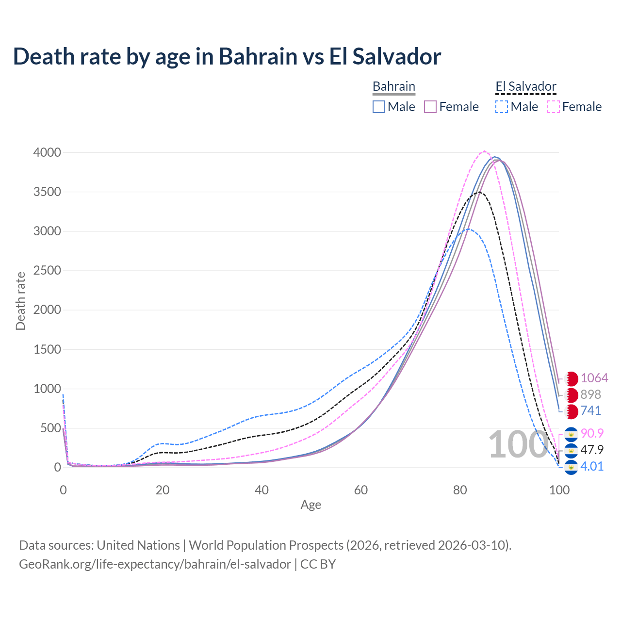 This life expectancy calculator shows the odds of living to 100, 95, 90, and below based on current age for both males and females in Bahrain and El Salvador, along with mean and median age of death. The calculations are based on the 2026 life tables (actuarial tables) from the UN World Population Prospects.
