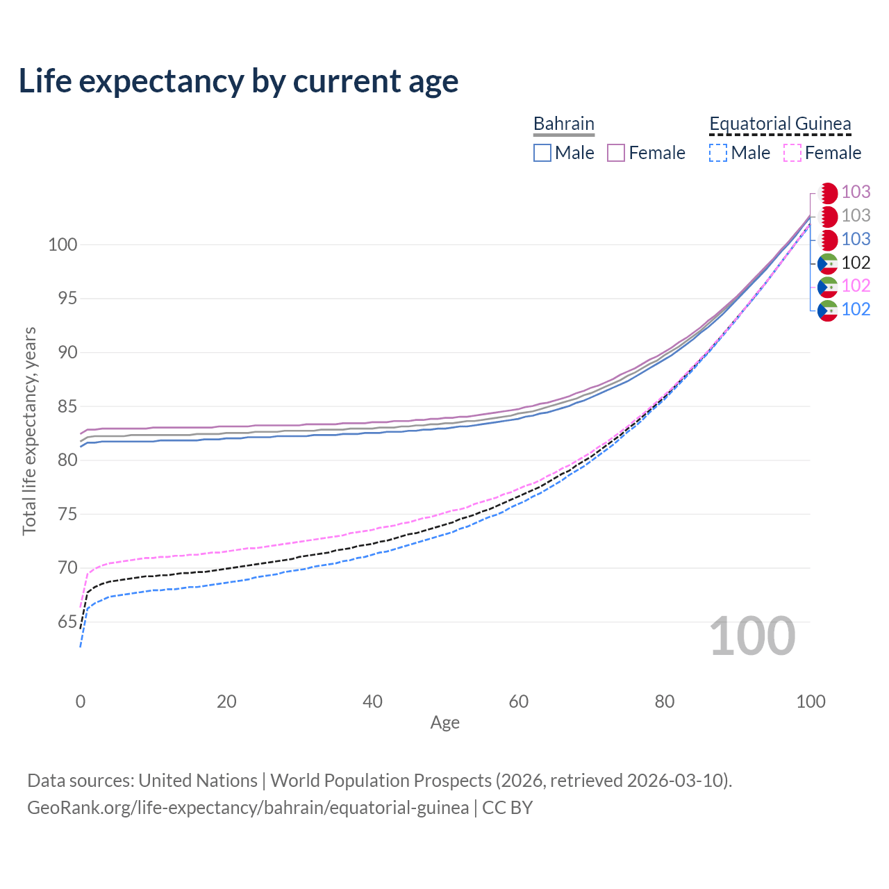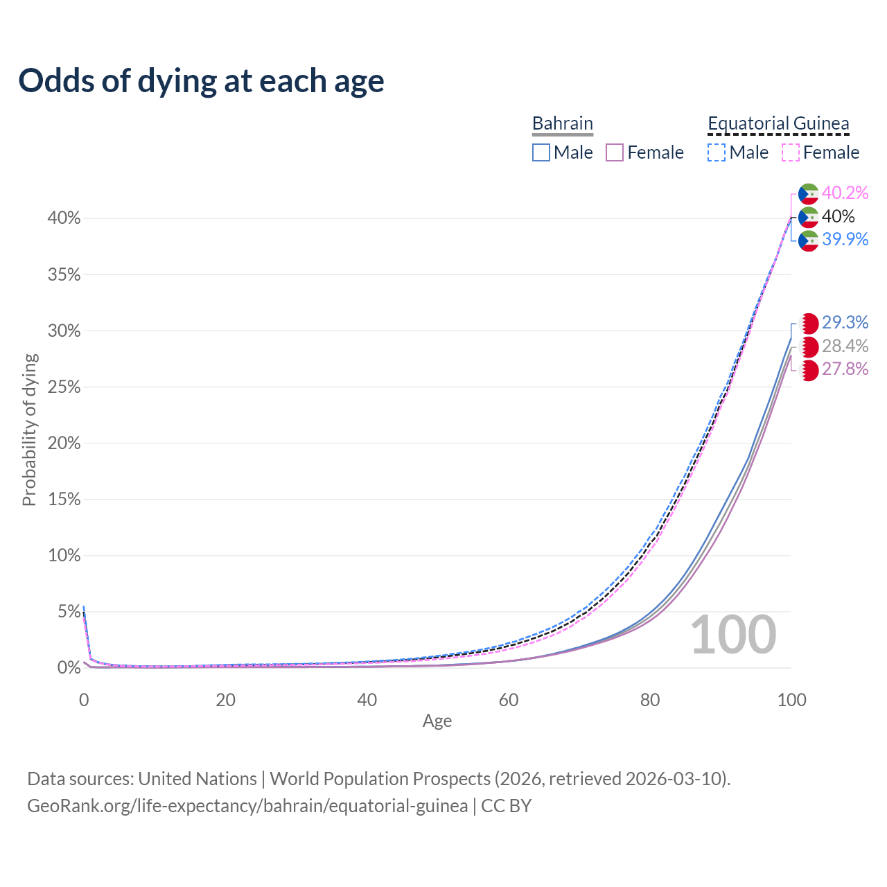 This life expectancy calculator shows the odds of living to 100, 95, 90, and below based on current age for both males and females in Bahrain and Equatorial Guinea, along with mean and median age of death. The calculations are based on the 2026 life tables (actuarial tables) from the UN World Population Prospects.
