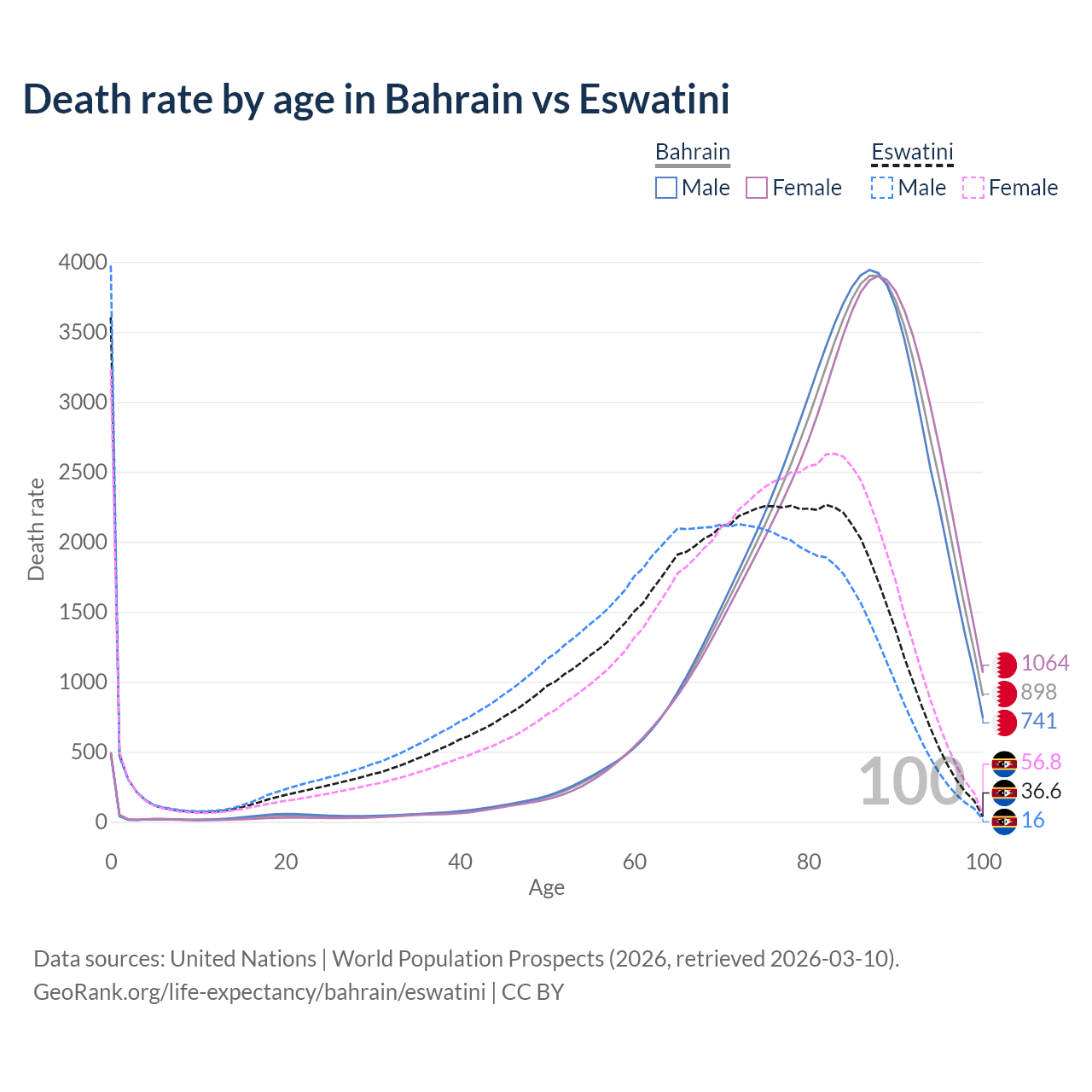 This life expectancy calculator shows the odds of living to 100, 95, 90, and below based on current age for both males and females in Bahrain and Eswatini, along with mean and median age of death. The calculations are based on the 2026 life tables (actuarial tables) from the UN World Population Prospects.