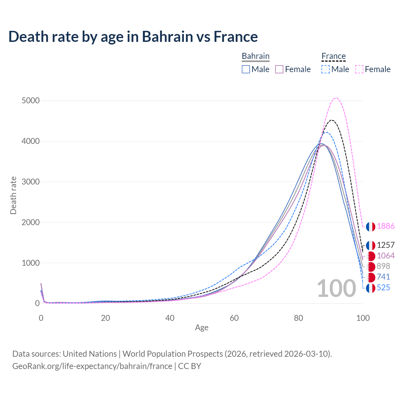 In Bahrain, the most common age of death is 88, compared to 90 in France. The median age of death is 84.4 in Bahrain and 87.4 in France, meaning only half of each cohort is expected to live past that age.
