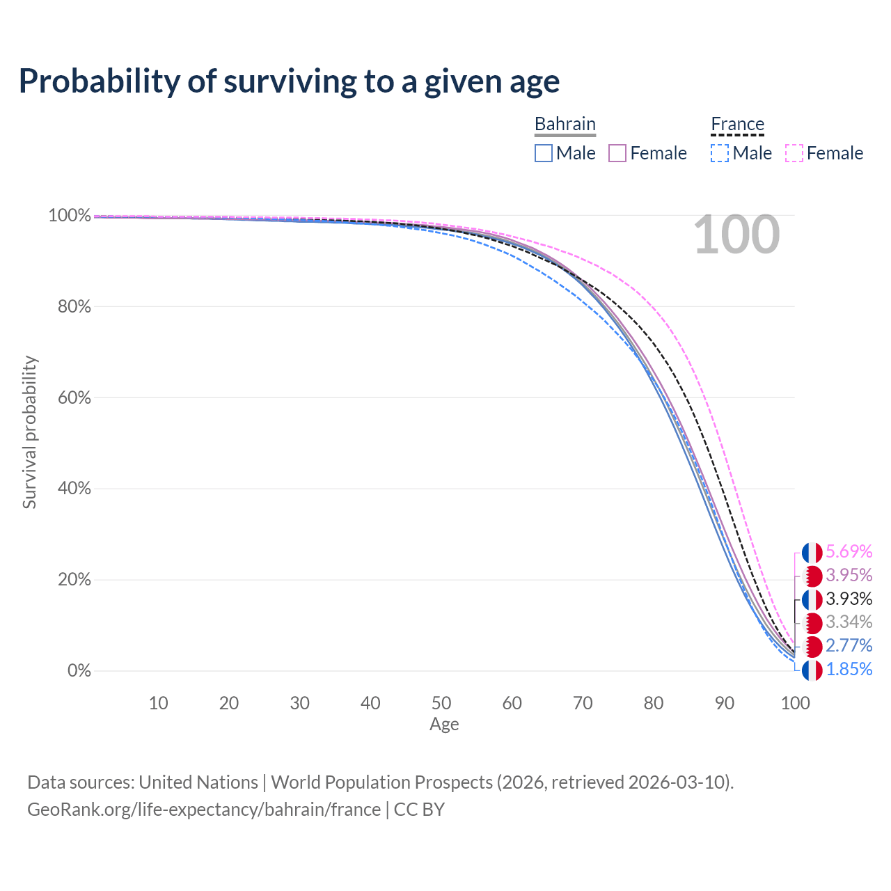 This life expectancy calculator shows the odds of living to 100, 95, 90, and below based on current age for both males and females in Bahrain and France, along with mean and median age of death. The calculations are based on the 2026 life tables (actuarial tables) from the UN World Population Prospects.