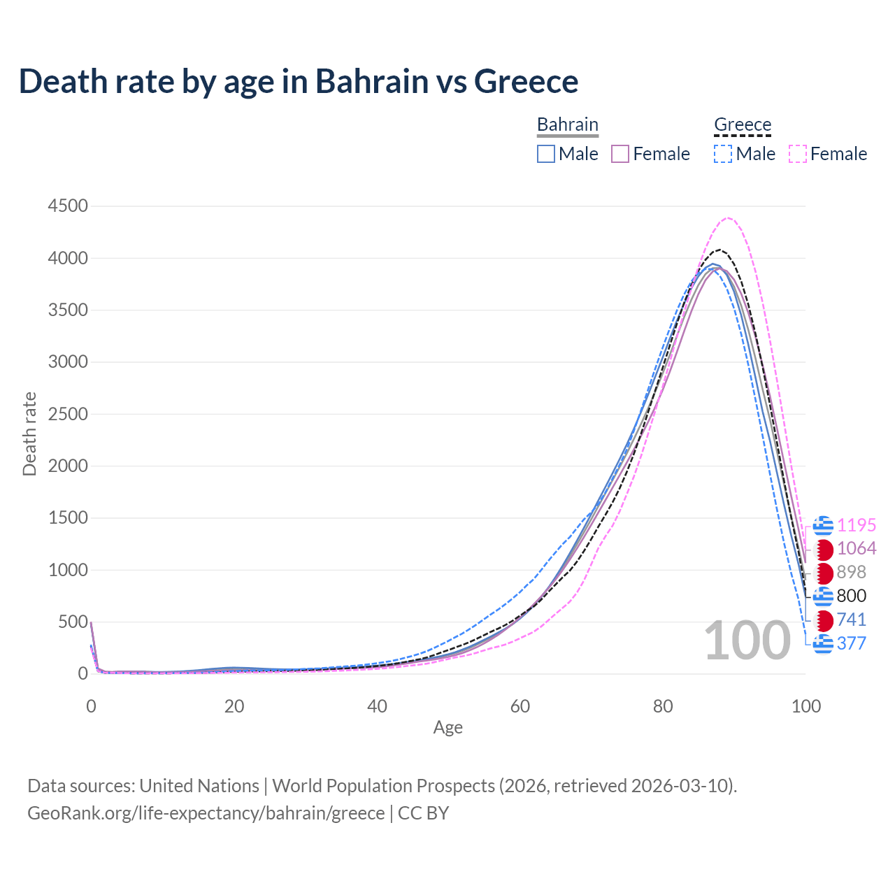 This life expectancy calculator shows the odds of living to 100, 95, 90, and below based on current age for both males and females in Bahrain and Greece, along with mean and median age of death. The calculations are based on the 2026 life tables (actuarial tables) from the UN World Population Prospects.