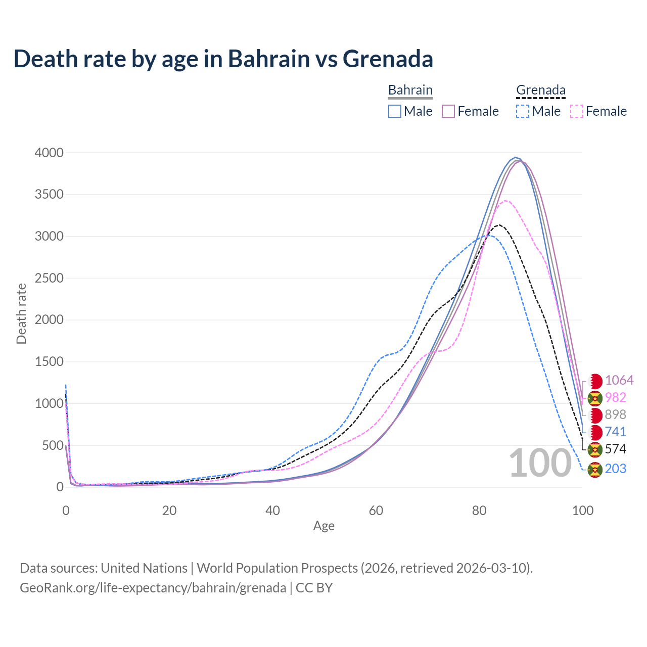In Bahrain, the most common age of death is 88, compared to 84 in Grenada. The median age of death is 84.4 in Bahrain and 79.3 in Grenada, meaning only half of each cohort is expected to live past that age.