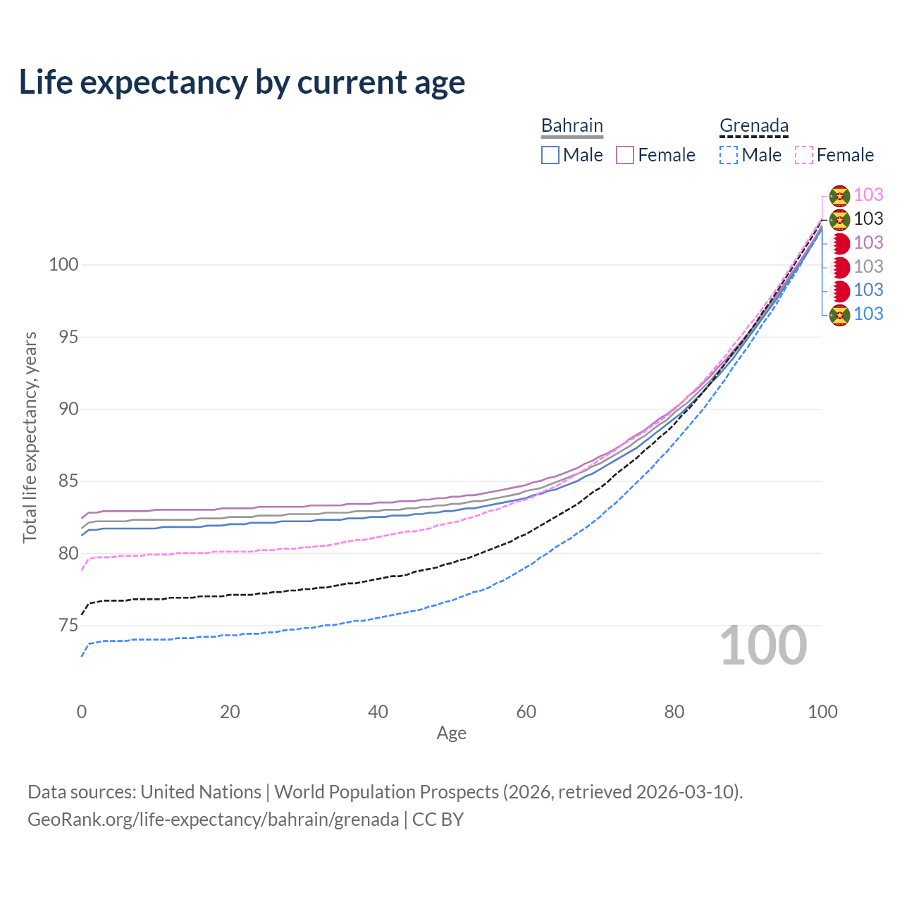 This life expectancy calculator shows the odds of living to 100, 95, 90, and below based on current age for both males and females in Bahrain and Grenada, along with mean and median age of death. The calculations are based on the 2026 life tables (actuarial tables) from the UN World Population Prospects.