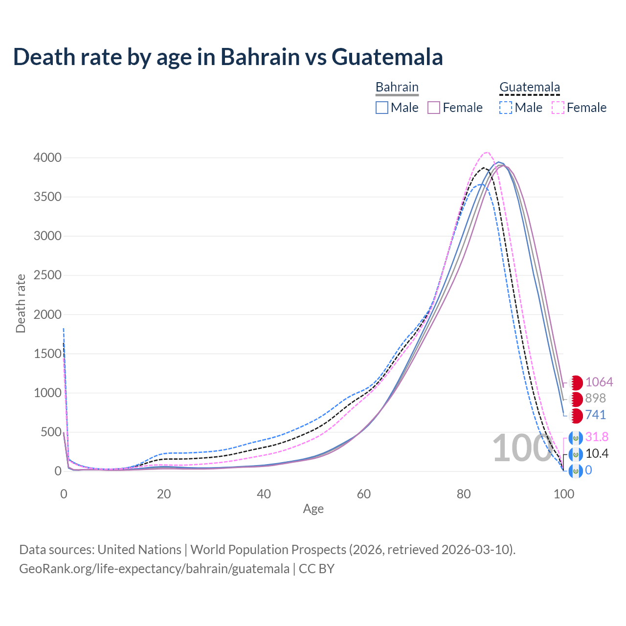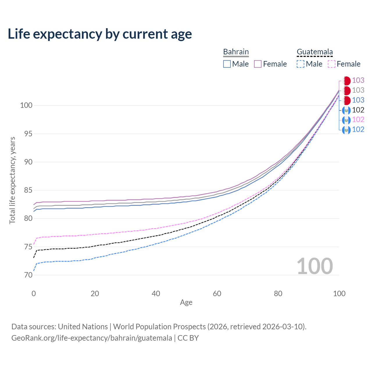 This life expectancy calculator shows the odds of living to 100, 95, 90, and below based on current age for both males and females in Bahrain and Guatemala, along with mean and median age of death. The calculations are based on the 2026 life tables (actuarial tables) from the UN World Population Prospects.