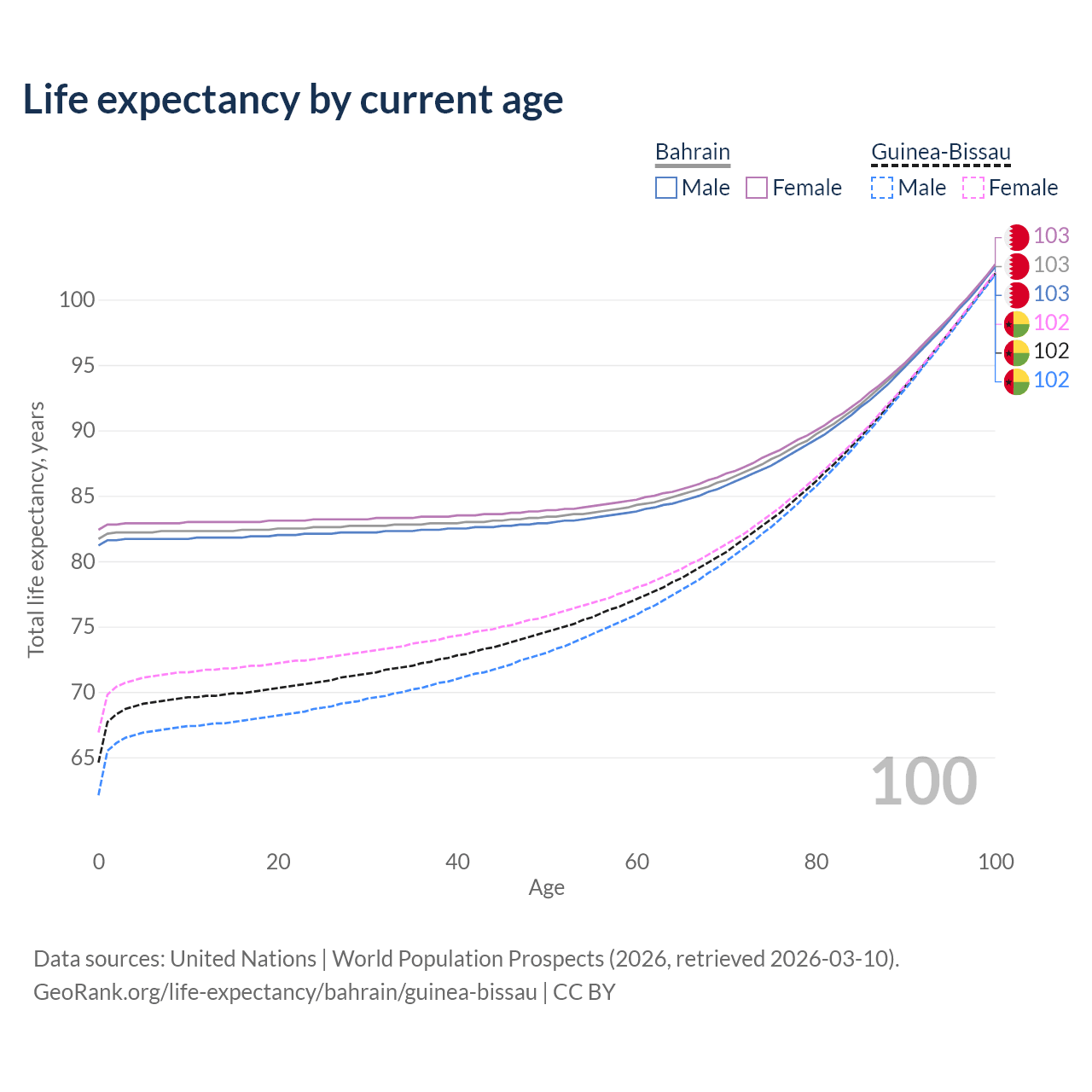 This life expectancy calculator shows the odds of living to 100, 95, 90, and below based on current age for both males and females in Bahrain and Guinea-Bissau, along with mean and median age of death. The calculations are based on the 2026 life tables (actuarial tables) from the UN World Population Prospects.