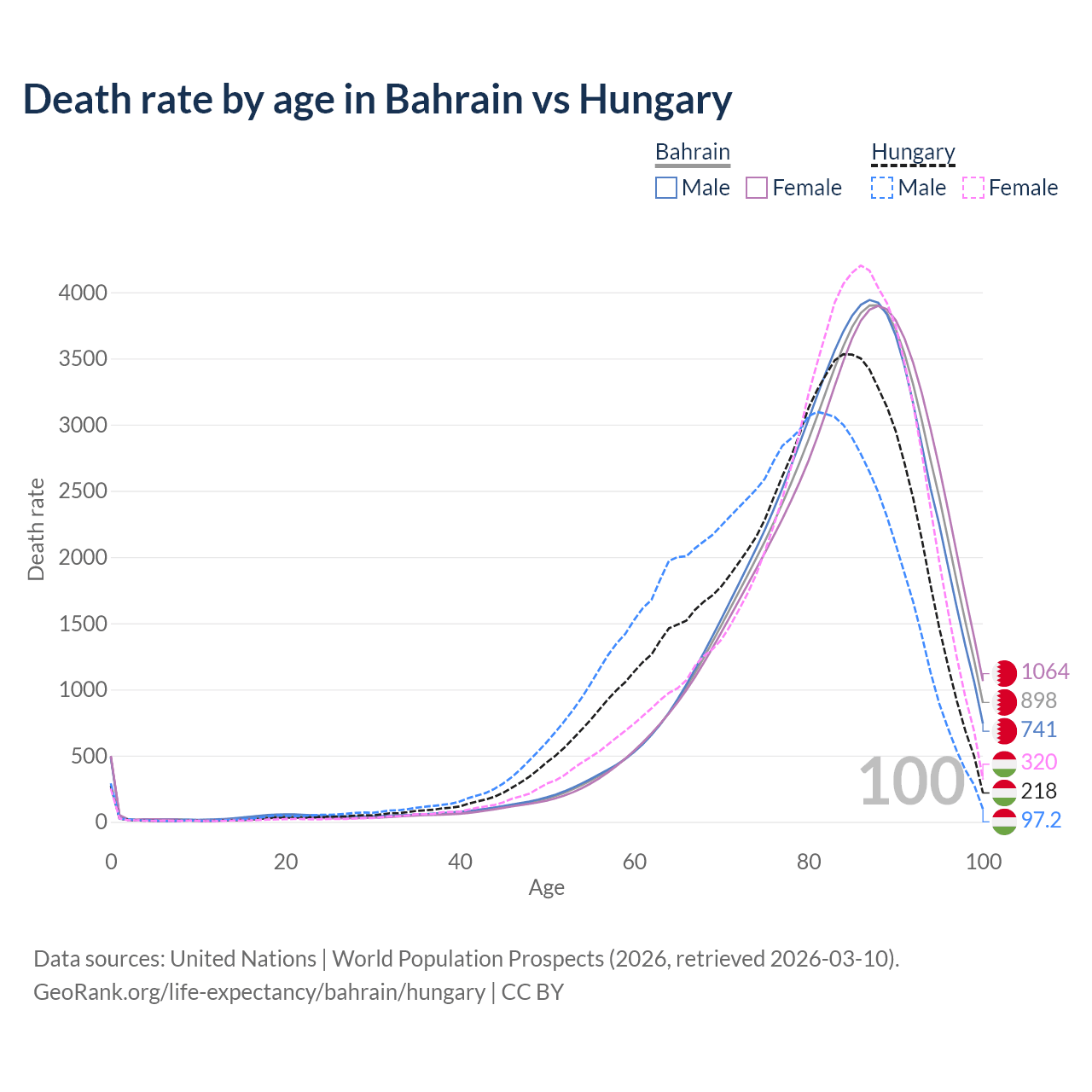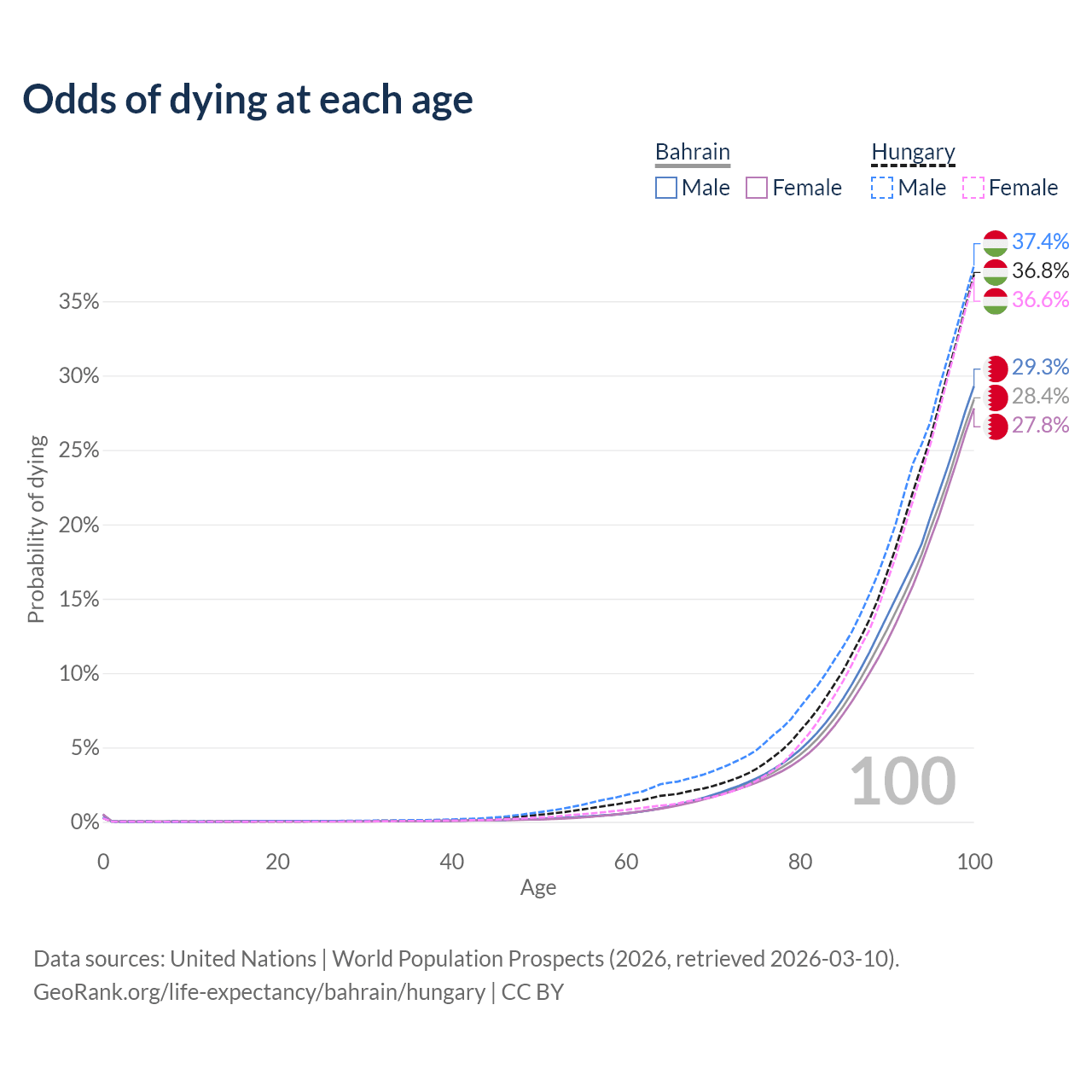 This life expectancy calculator shows the odds of living to 100, 95, 90, and below based on current age for both males and females in Bahrain and Hungary, along with mean and median age of death. The calculations are based on the 2026 life tables (actuarial tables) from the UN World Population Prospects.