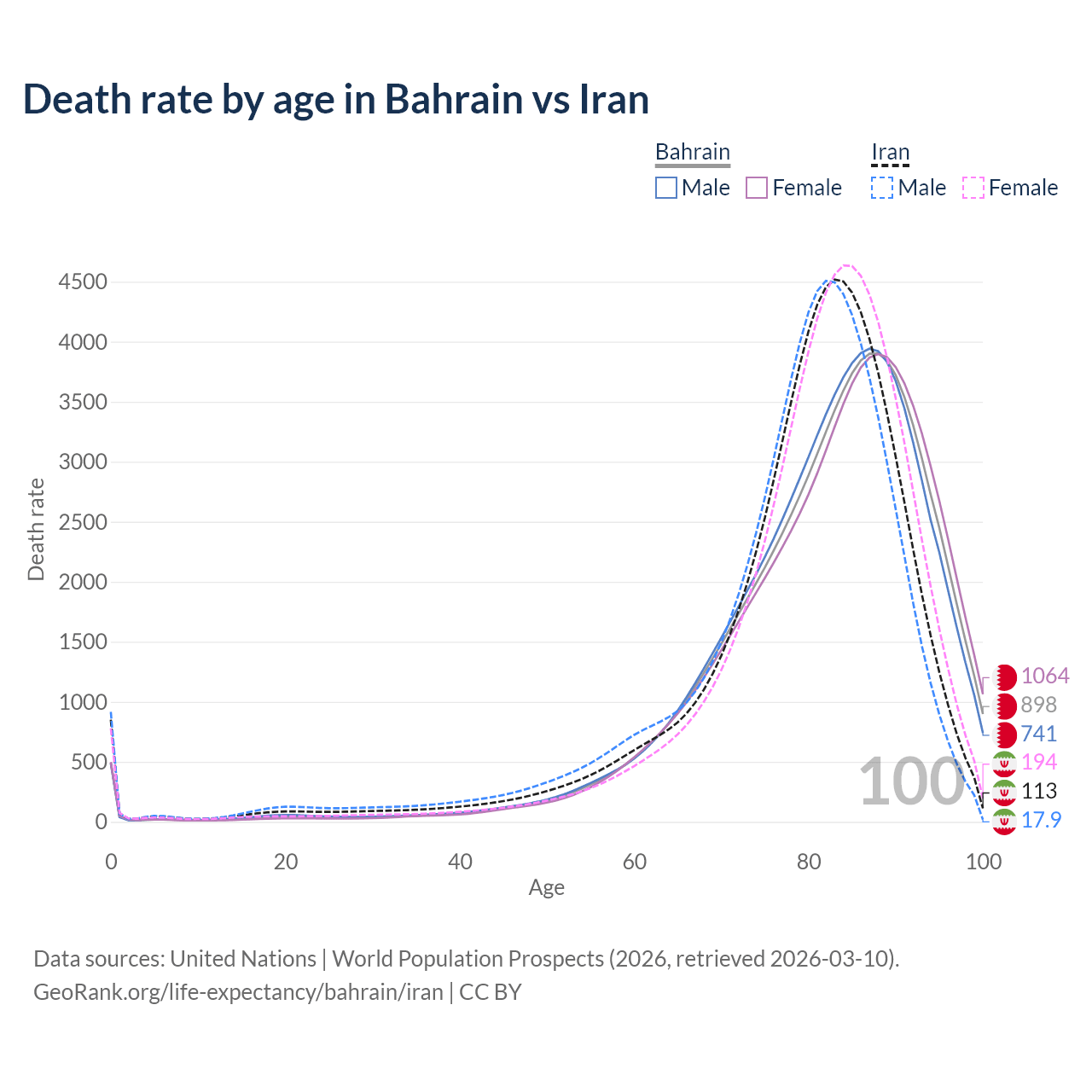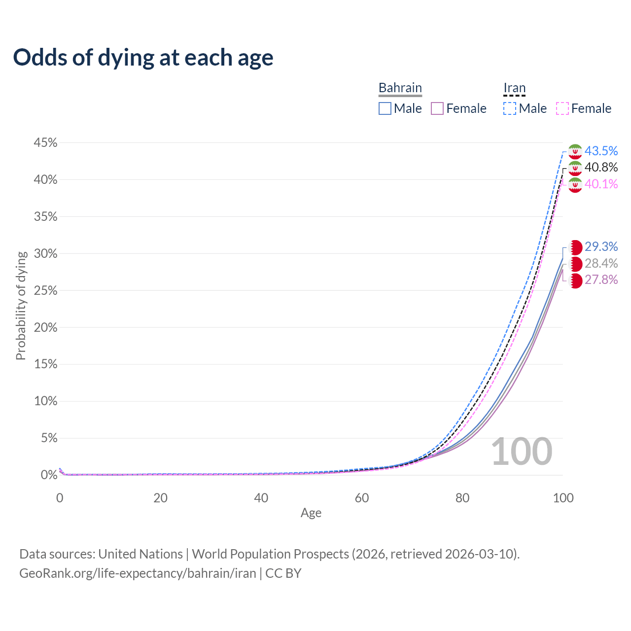 This life expectancy calculator shows the odds of living to 100, 95, 90, and below based on current age for both males and females in Bahrain and Iran, along with mean and median age of death. The calculations are based on the 2026 life tables (actuarial tables) from the UN World Population Prospects.