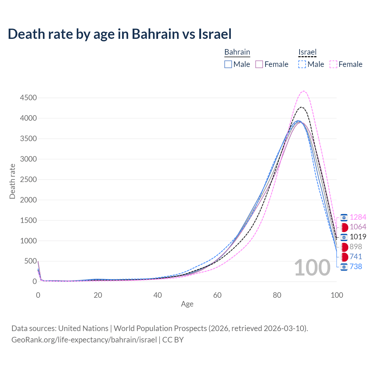 In Bahrain, the most common age of death is 88, compared to 88 in Israel. The median age of death is 84.4 in Bahrain and 85.6 in Israel, meaning only half of each cohort is expected to live past that age.