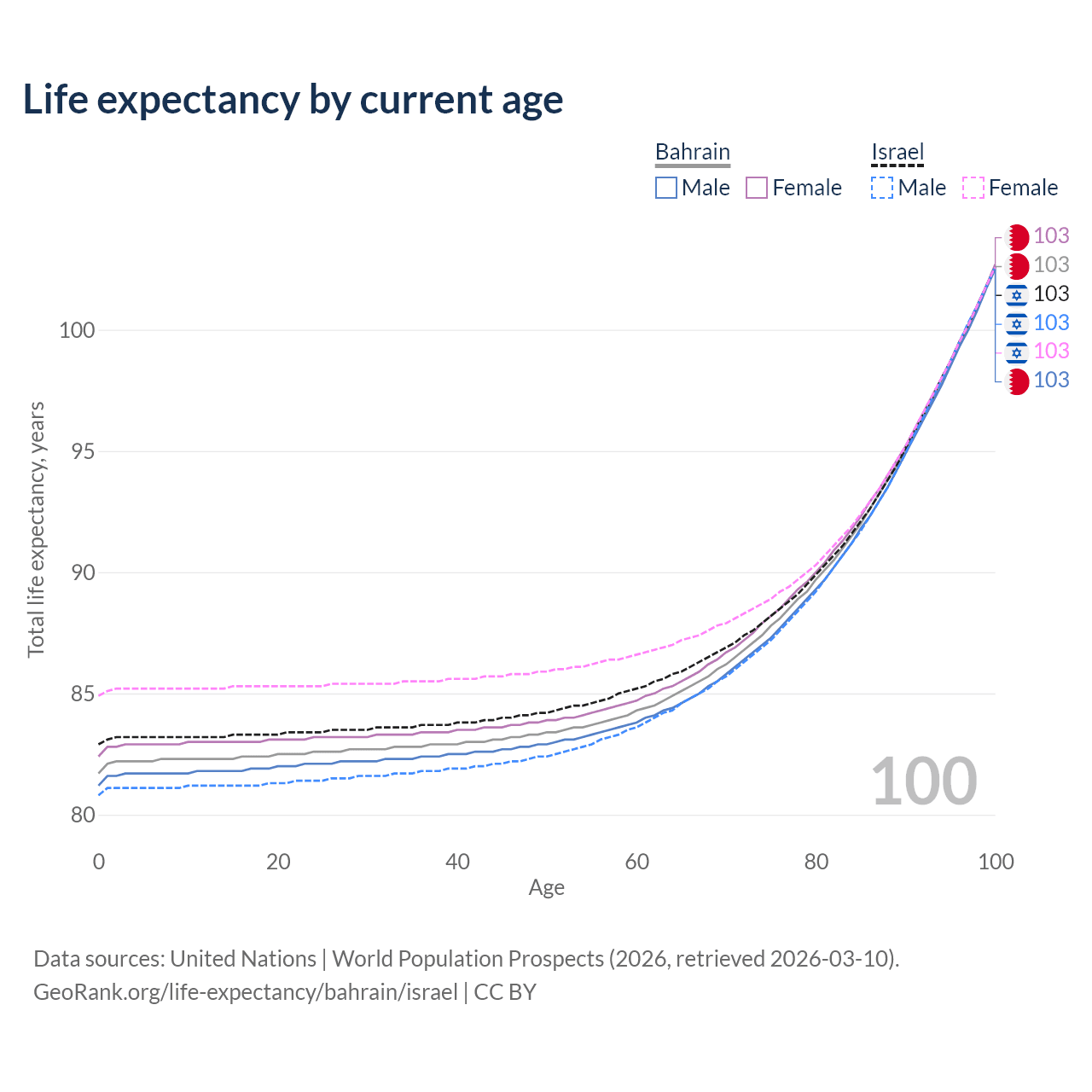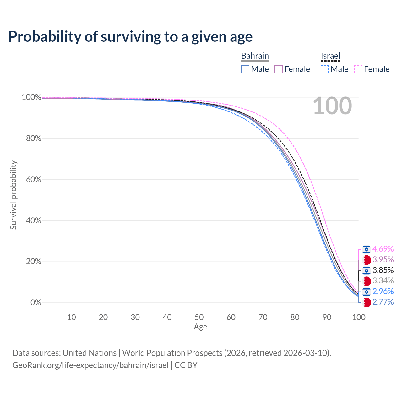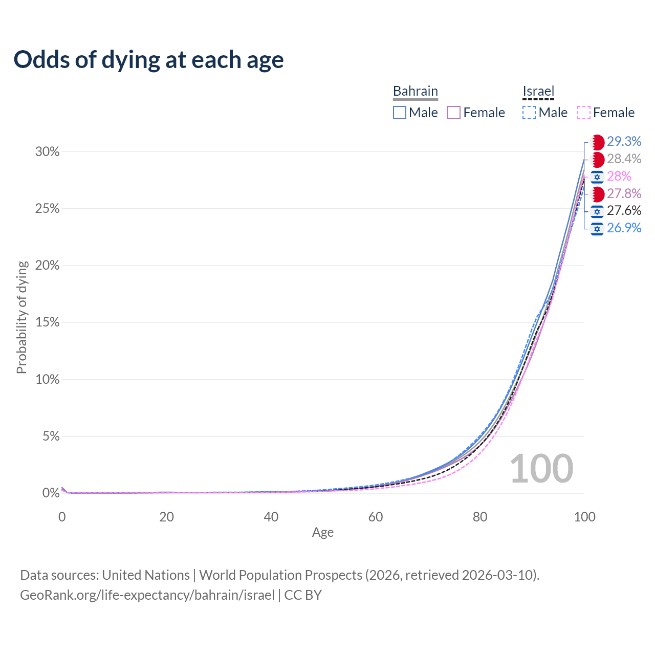 This life expectancy calculator shows the odds of living to 100, 95, 90, and below based on current age for both males and females in Bahrain and Israel, along with mean and median age of death. The calculations are based on the 2026 life tables (actuarial tables) from the UN World Population Prospects.