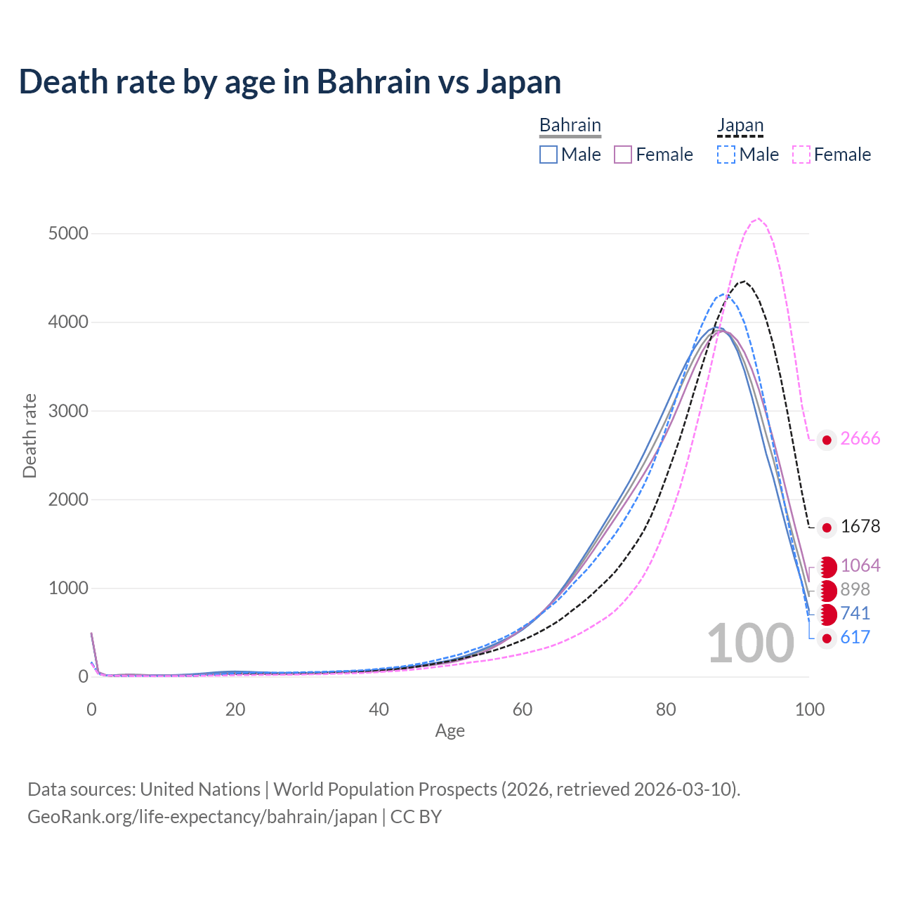 In Bahrain, the most common age of death is 88, compared to 91 in Japan. The median age of death is 84.4 in Bahrain and 88.1 in Japan, meaning only half of each cohort is expected to live past that age.