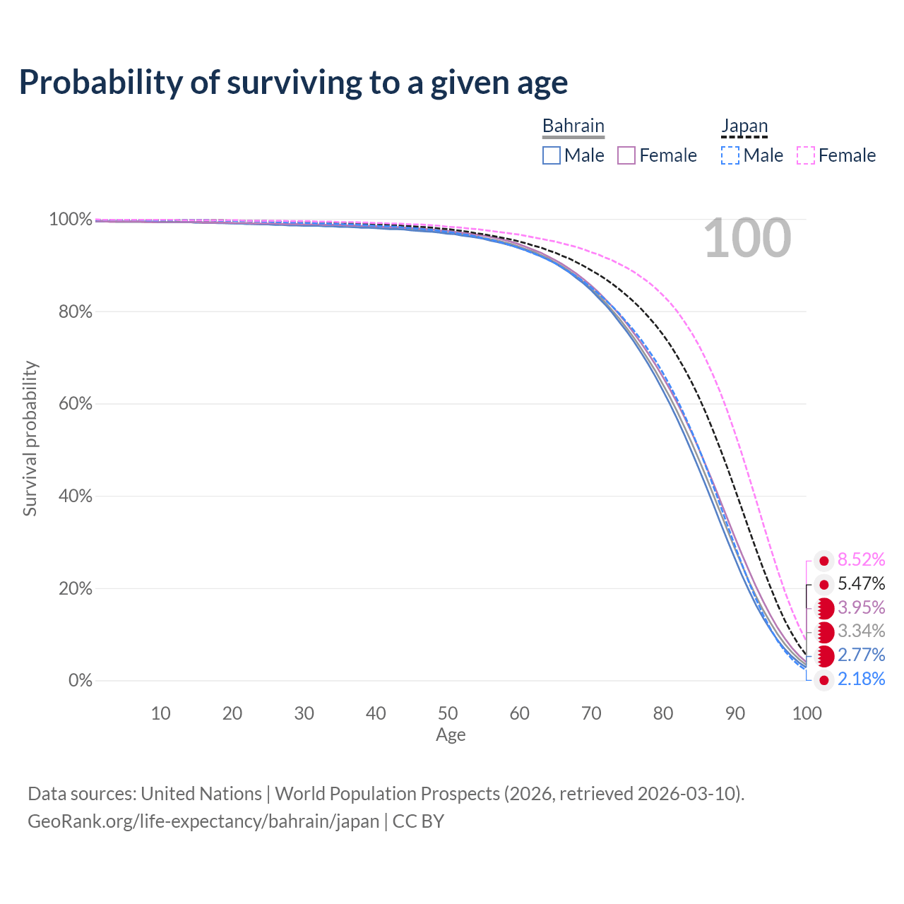 This life expectancy calculator shows the odds of living to 100, 95, 90, and below based on current age for both males and females in Bahrain and Japan, along with mean and median age of death. The calculations are based on the 2026 life tables (actuarial tables) from the UN World Population Prospects.