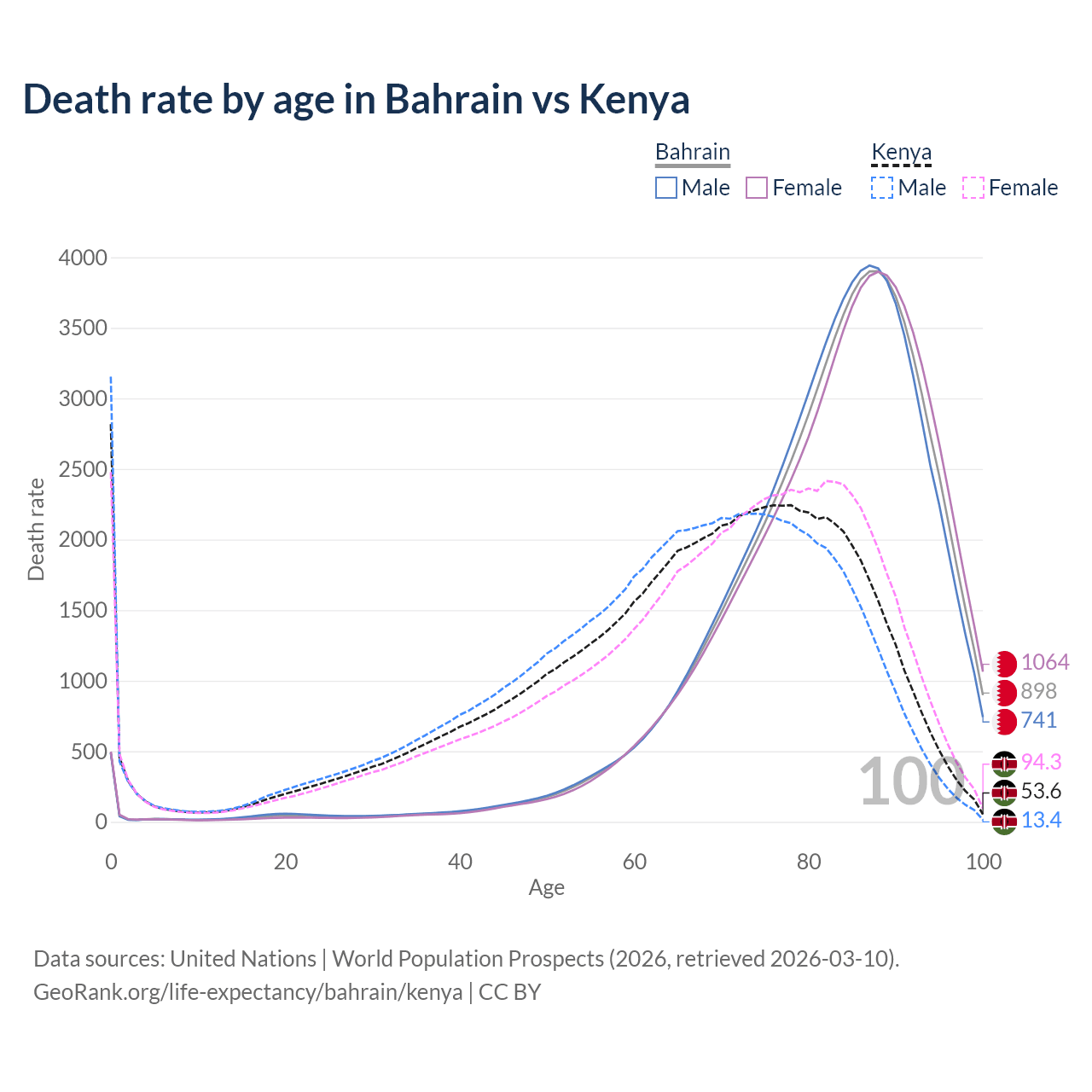 This life expectancy calculator shows the odds of living to 100, 95, 90, and below based on current age for both males and females in Bahrain and Kenya, along with mean and median age of death. The calculations are based on the 2026 life tables (actuarial tables) from the UN World Population Prospects.