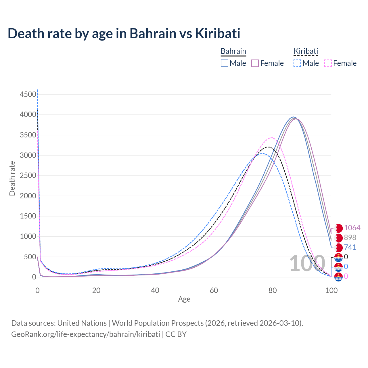 This life expectancy calculator shows the odds of living to 100, 95, 90, and below based on current age for both males and females in Bahrain and Kiribati, along with mean and median age of death. The calculations are based on the 2026 life tables (actuarial tables) from the UN World Population Prospects.