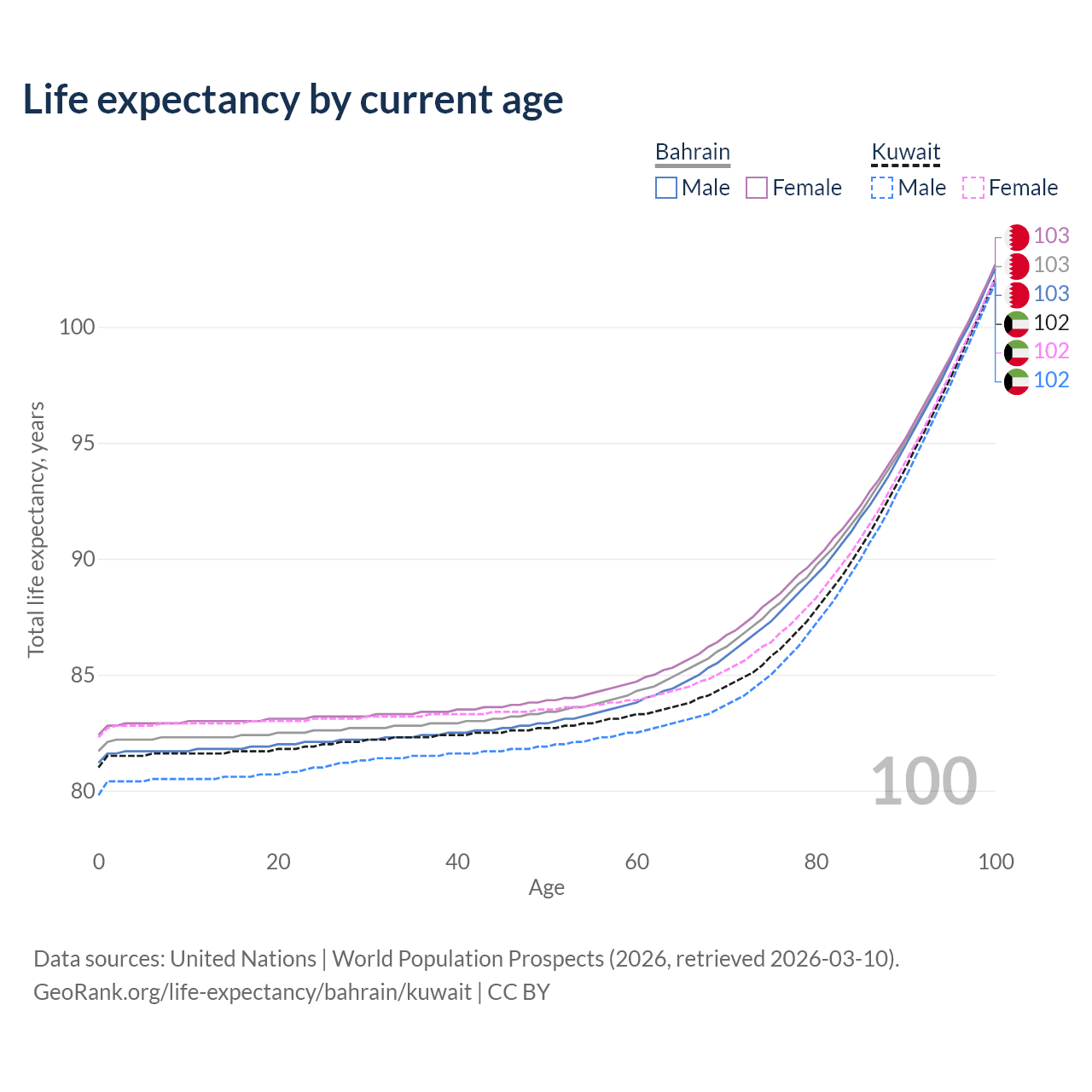 This life expectancy calculator shows the odds of living to 100, 95, 90, and below based on current age for both males and females in Bahrain and Kuwait, along with mean and median age of death. The calculations are based on the 2026 life tables (actuarial tables) from the UN World Population Prospects.