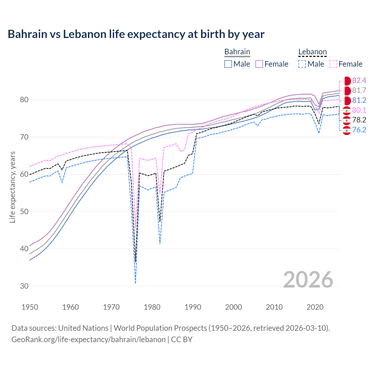 The average life expectancy at birth is 81.7 years in Bahrain vs 78.2 in Lebanon. Bahrain is ranked 36/197 by life expectancy, and Lebanon is 62/197. In Bahrain, the life expectancy is 81.2 years for males and 82.4 years for females. In Lebanon, it's 76.2 years for males and 80.1 years for females.