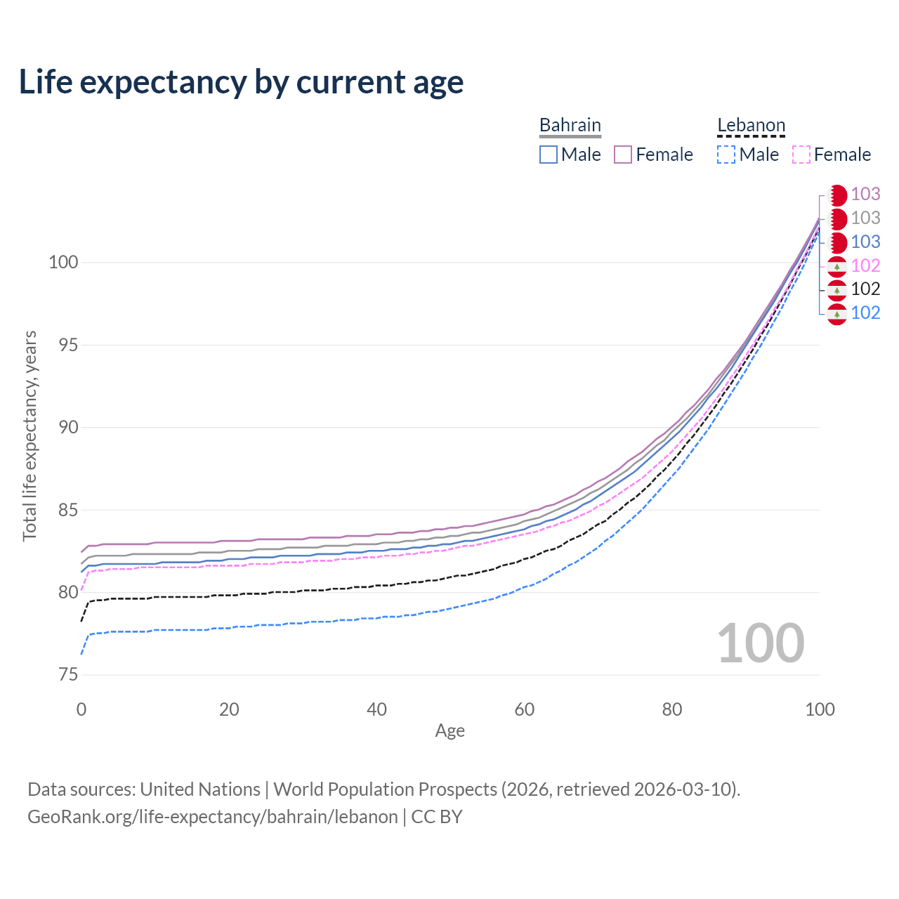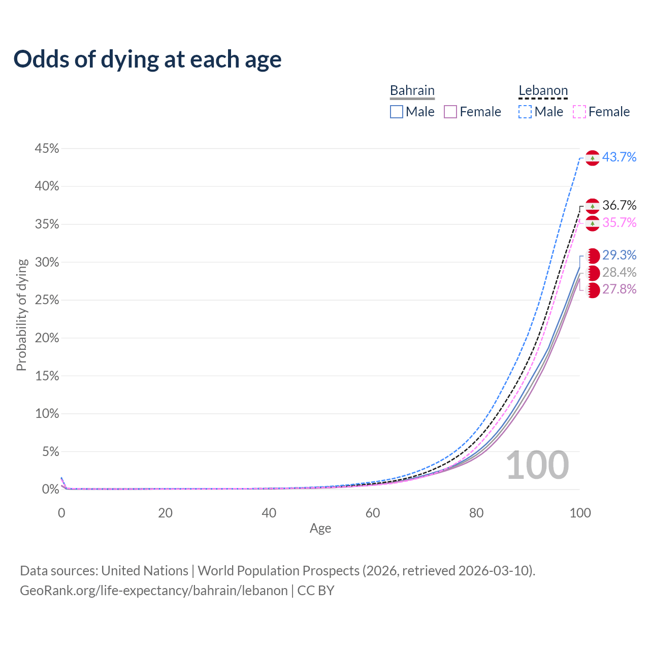 This life expectancy calculator shows the odds of living to 100, 95, 90, and below based on current age for both males and females in Bahrain and Lebanon, along with mean and median age of death. The calculations are based on the 2026 life tables (actuarial tables) from the UN World Population Prospects.