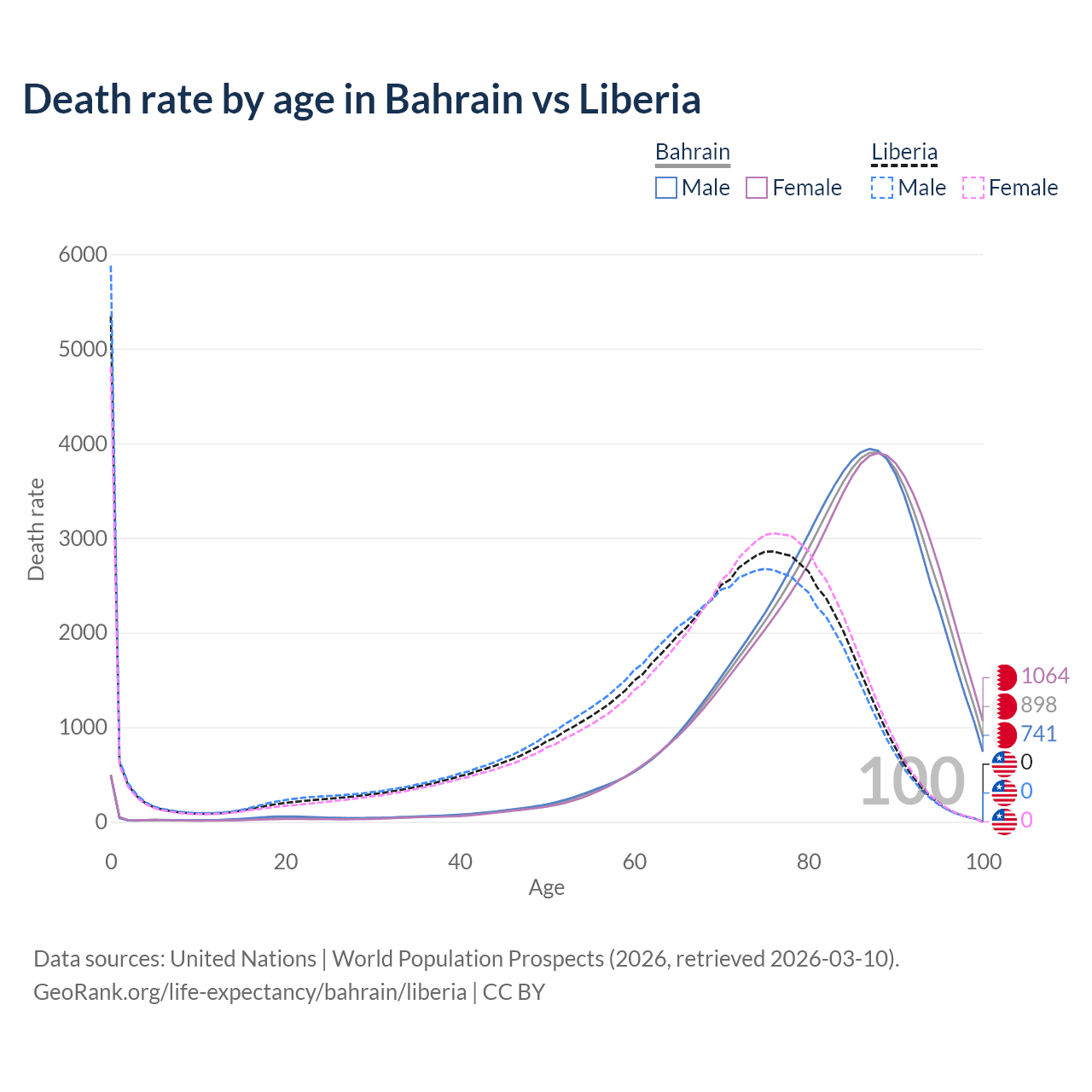 In Bahrain, the most common age of death is 88, compared to 0 in Liberia. The median age of death is 84.4 in Bahrain and 69.6 in Liberia, meaning only half of each cohort is expected to live past that age.