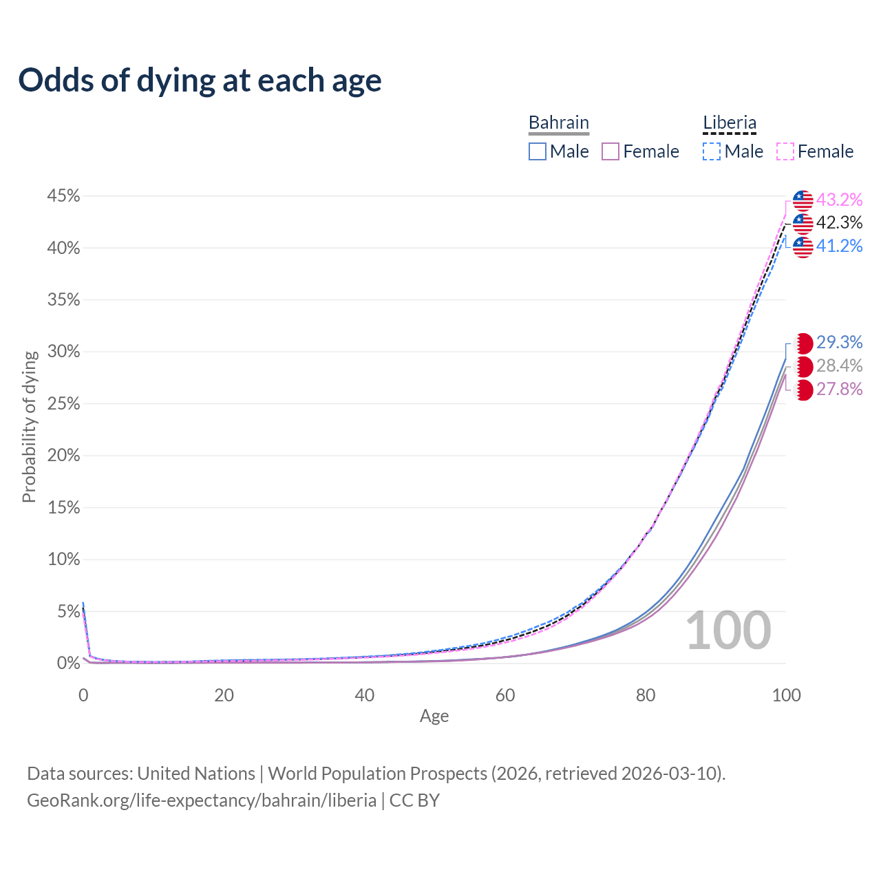 This life expectancy calculator shows the odds of living to 100, 95, 90, and below based on current age for both males and females in Bahrain and Liberia, along with mean and median age of death. The calculations are based on the 2026 life tables (actuarial tables) from the UN World Population Prospects.